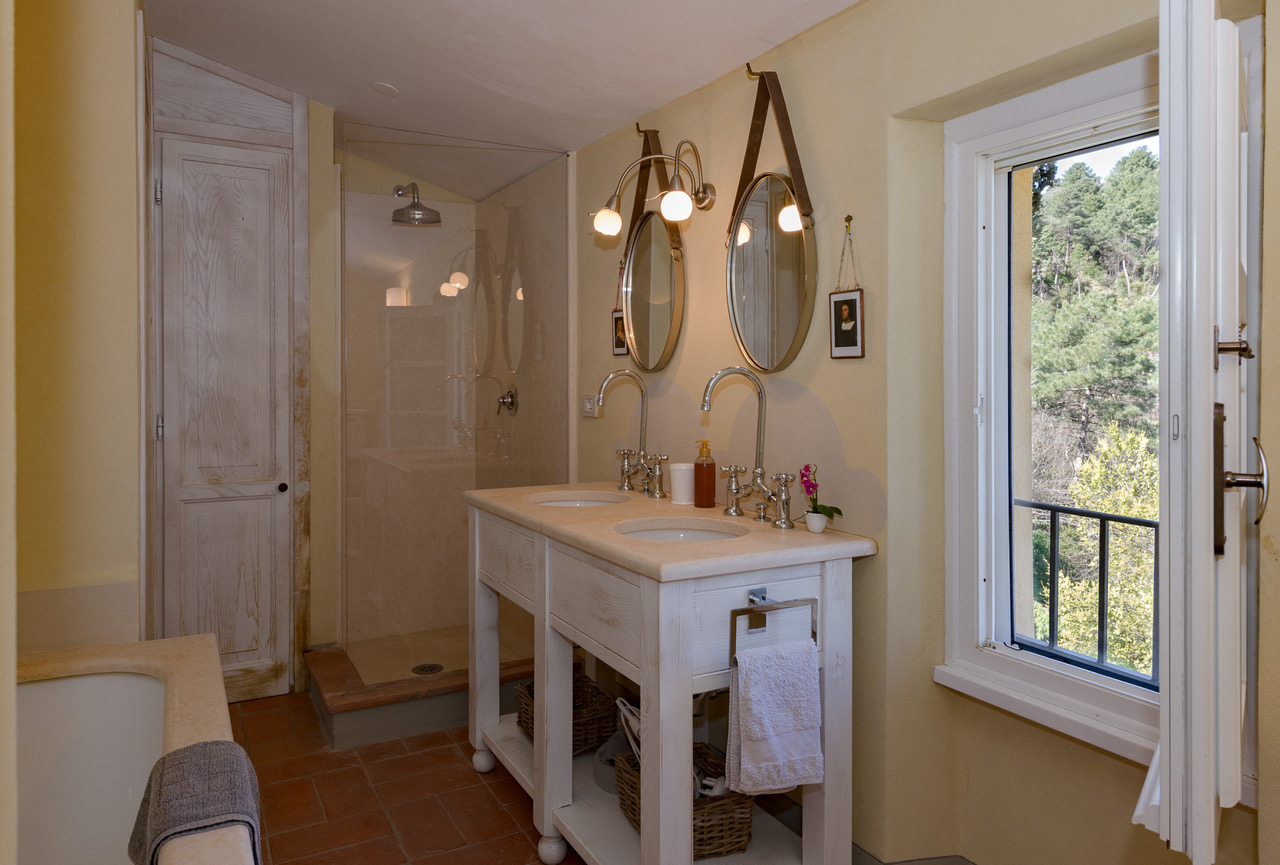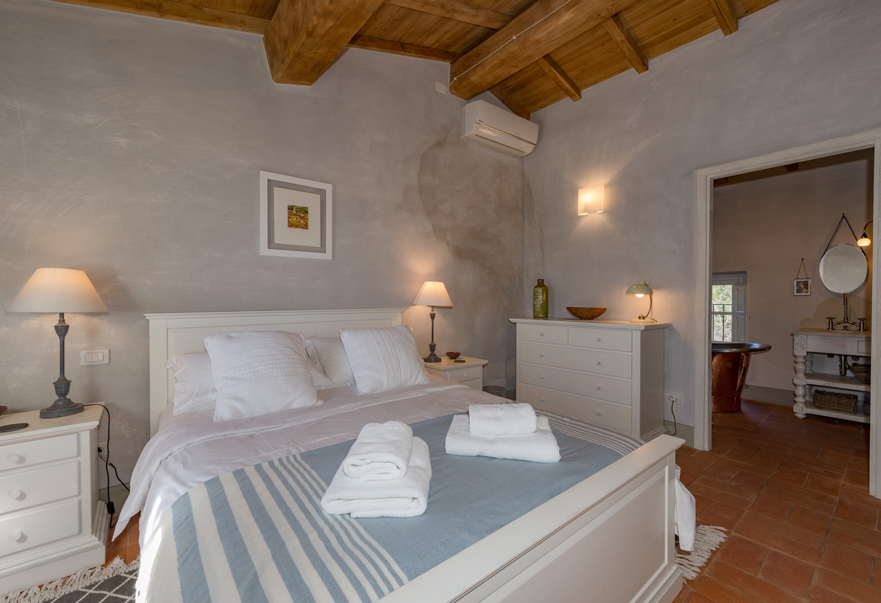 Double bedroom with views over the swimming pool, waterfall, olive groves and surrounding woodland with air conditioning, walk-in closet and Ensuite bathroom with bath, shower, hair dryer, double sink