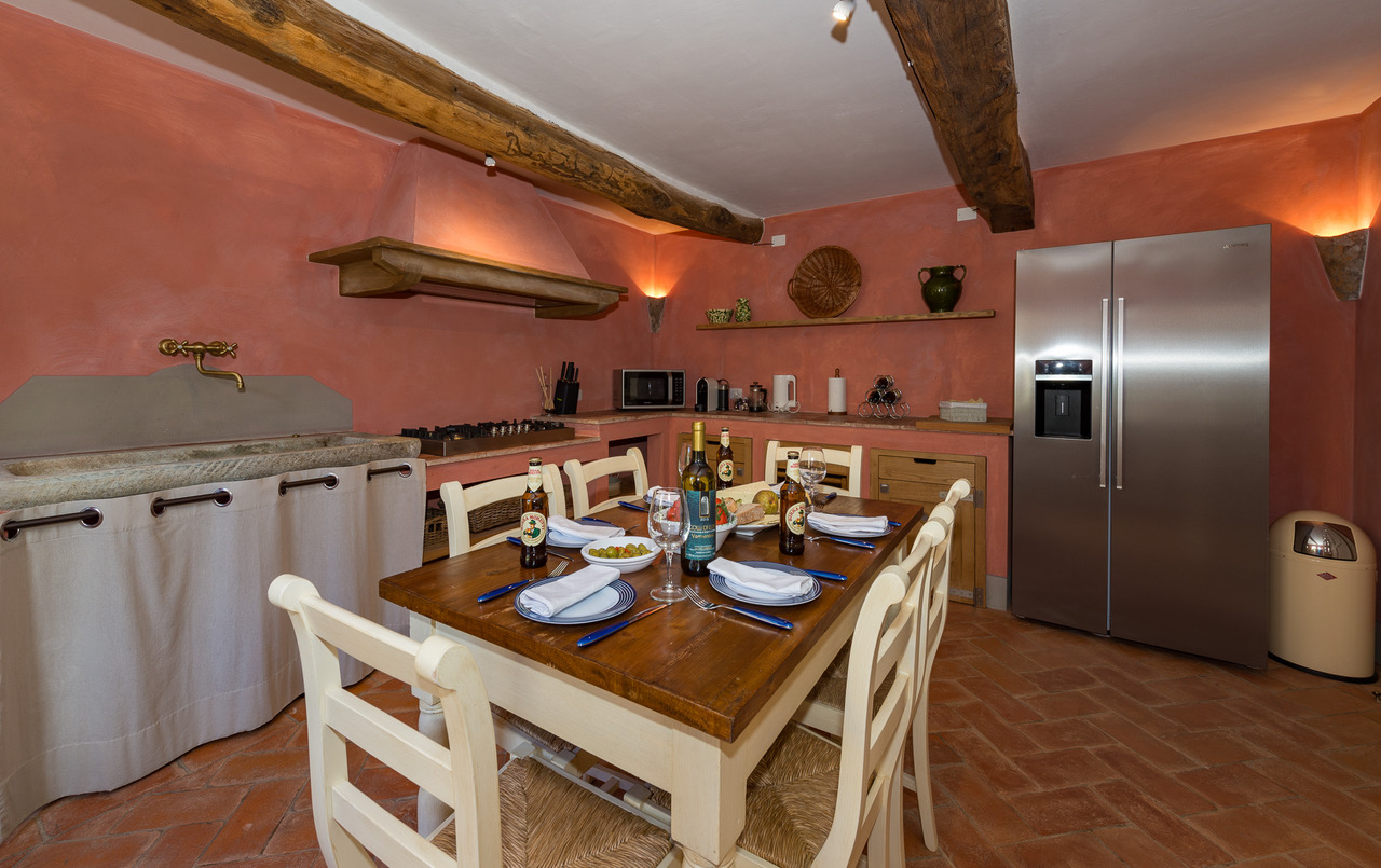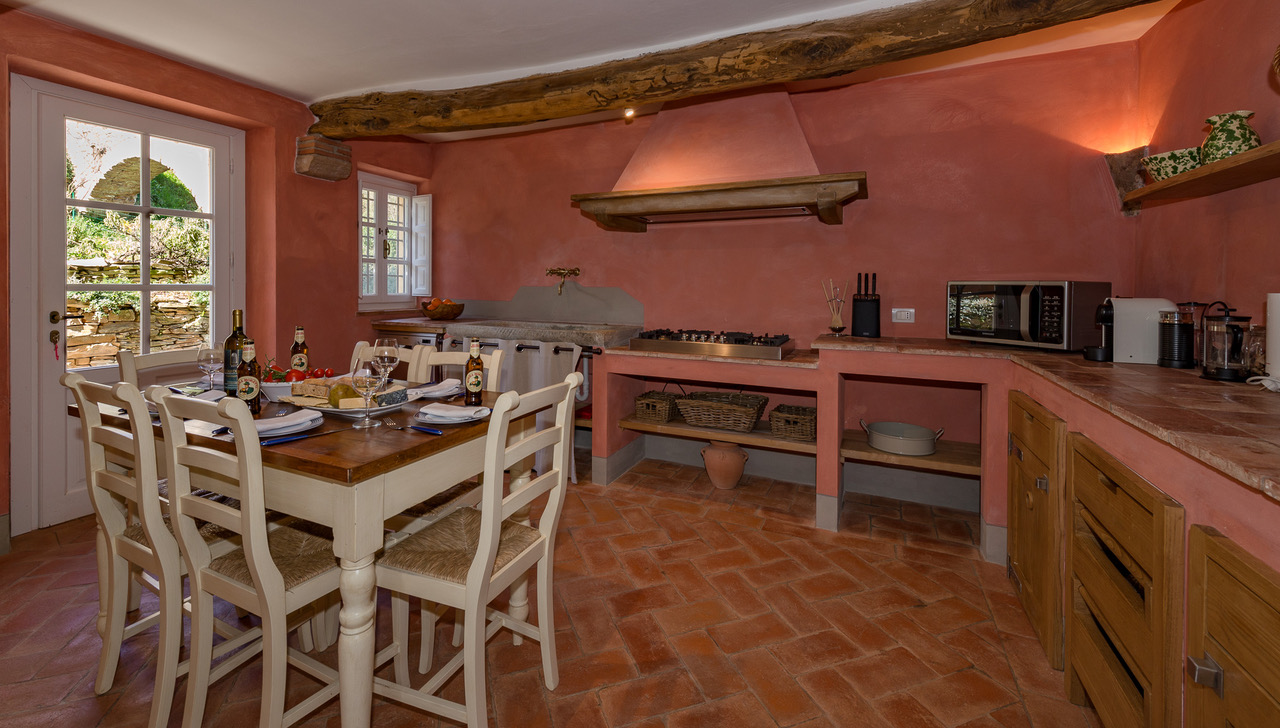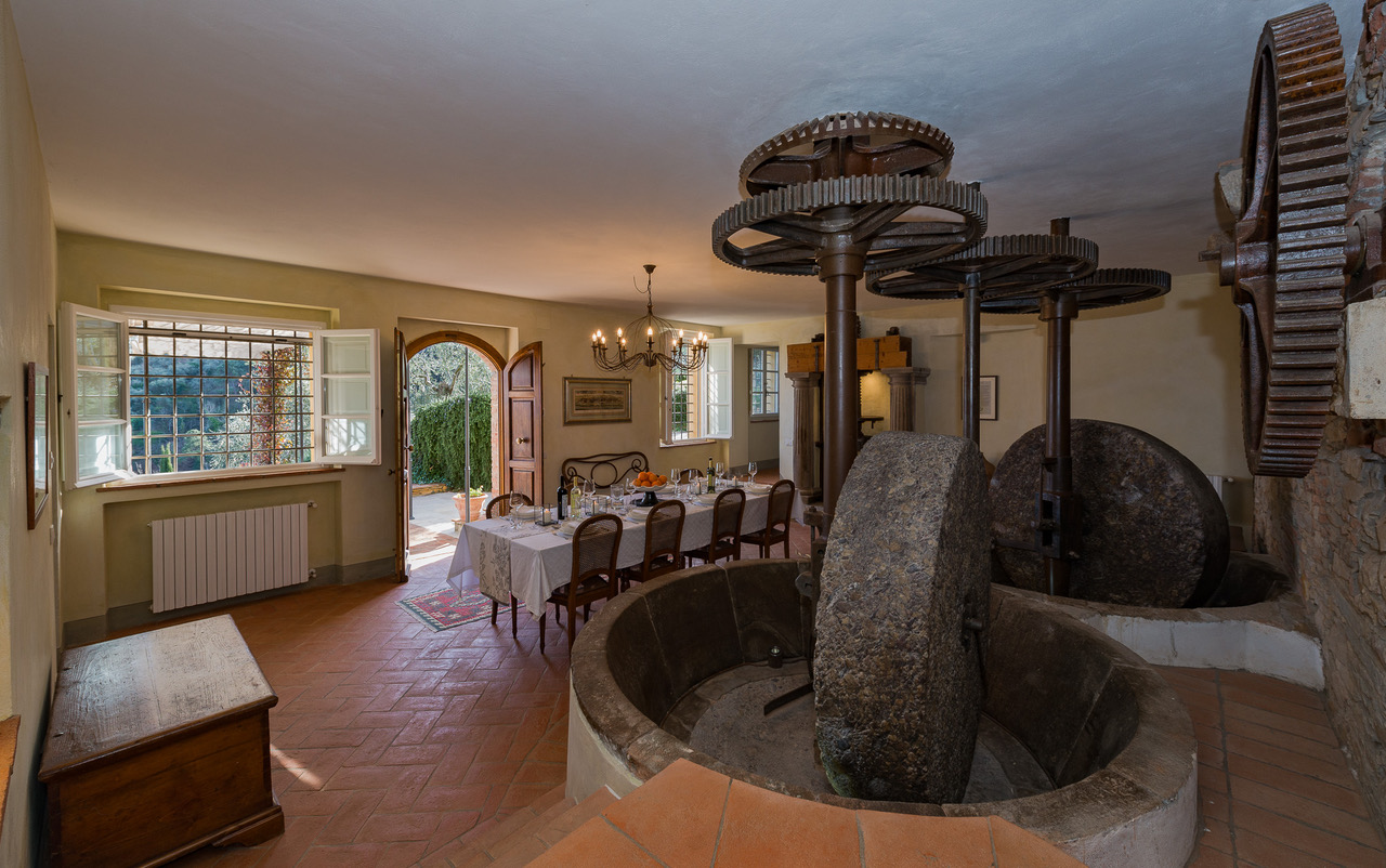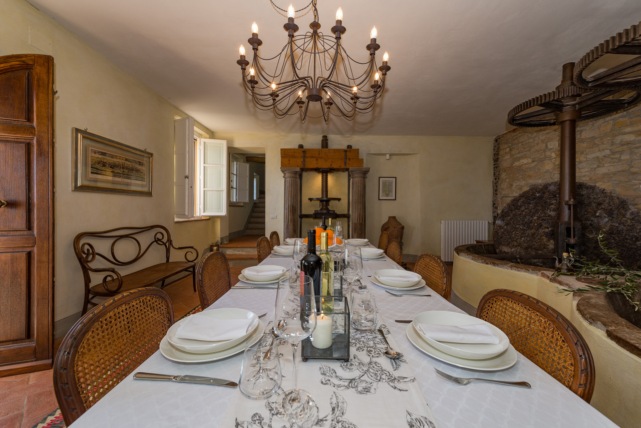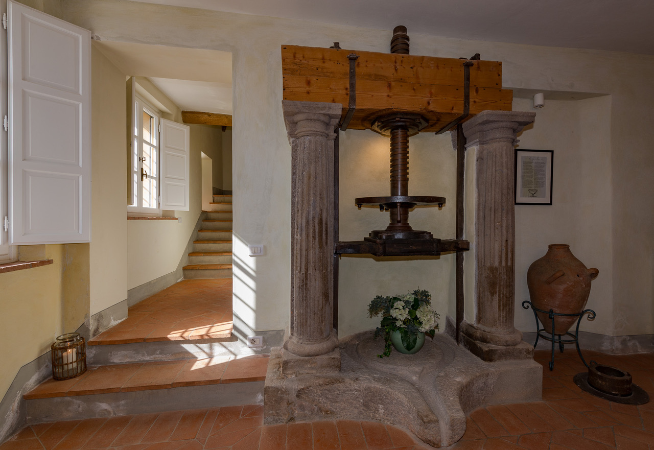 The authentic interiors evoke the rich past of this historic residence, from the internal workings of an olive press in the elegant dining room to the exposed wooden beams of the newly-renovated kitchen.
