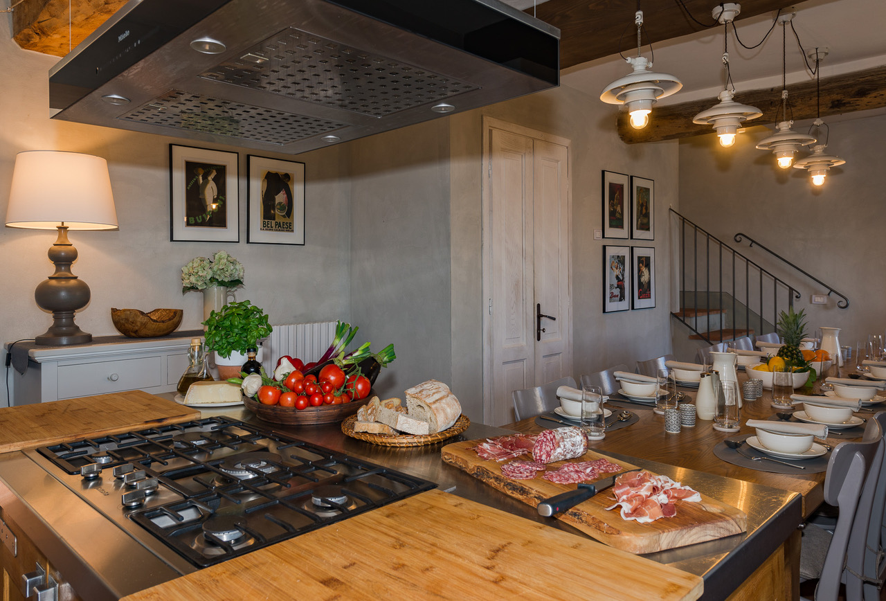 Kitchen with dining area perfect for cooking classes (access to the first-floor living room via a staircase) with gas stove, steam oven, fridge, freezer, dishwasher, nespresso machine, ice making machine, kettle, toaster, terrace access