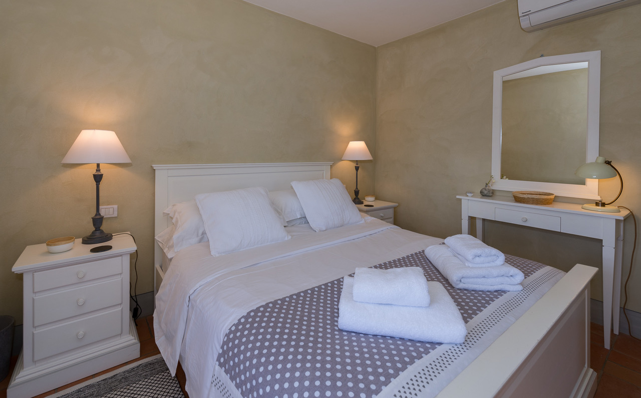 Master bedroom view over olive groves with air conditioning, mosquito net and Living Room and Ensuite bathroom with hair dryer, bath, shower, double sink