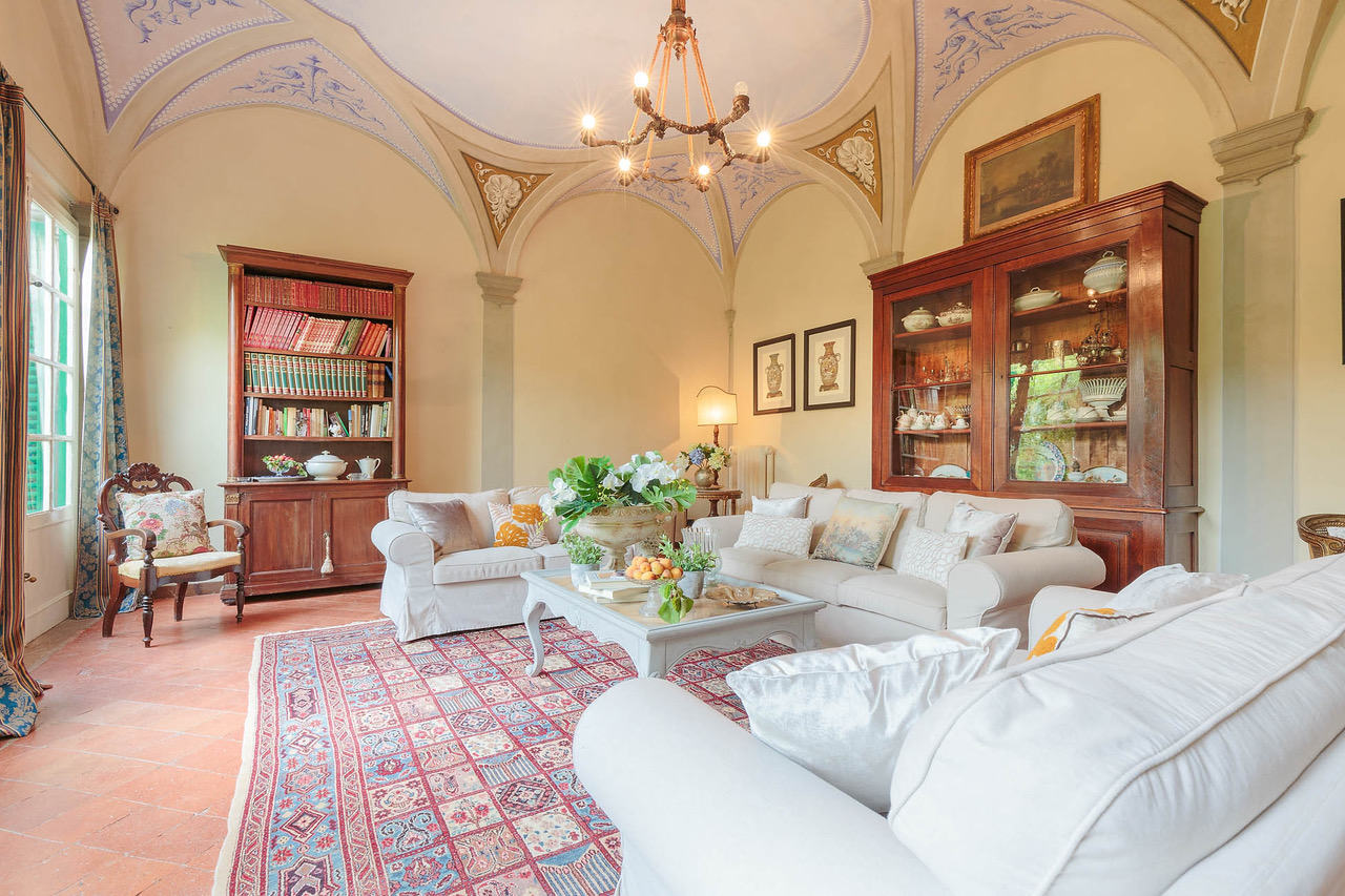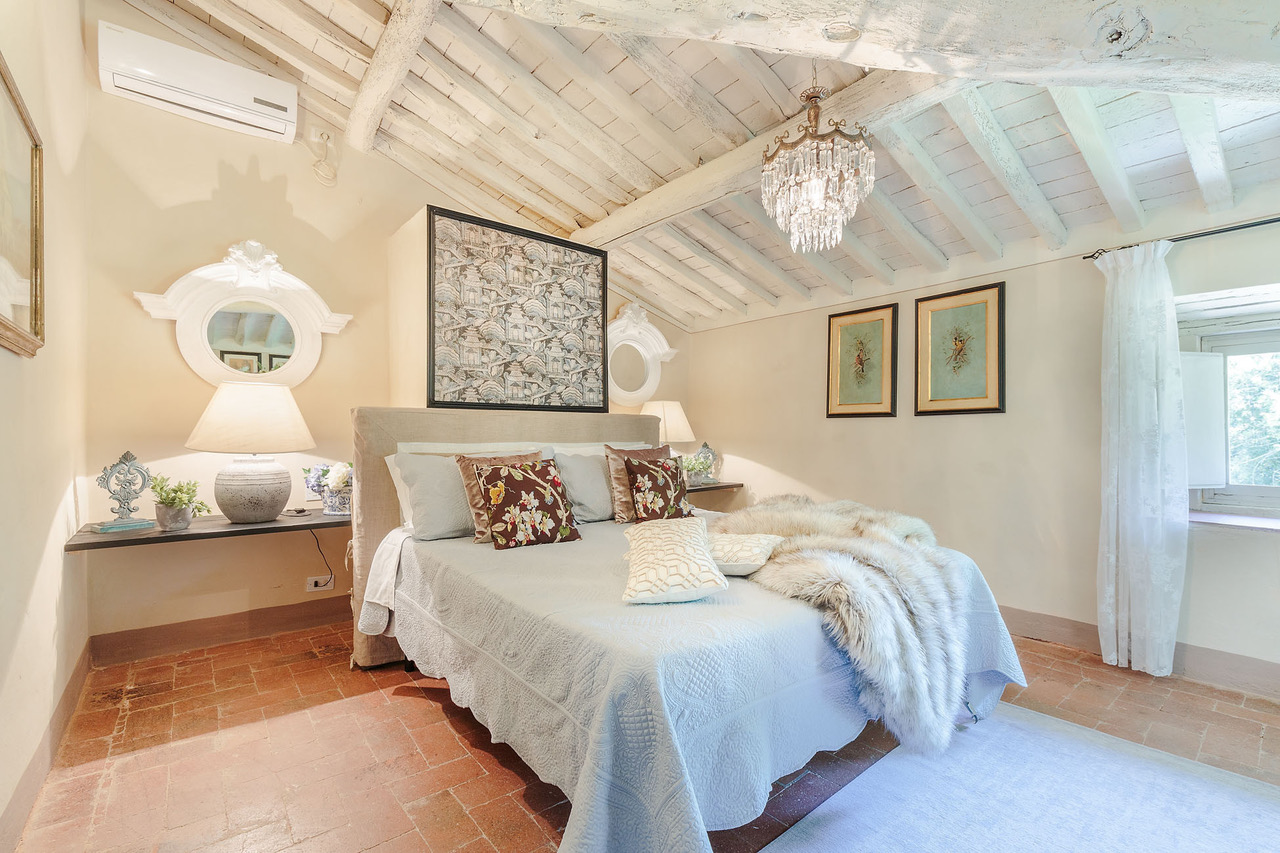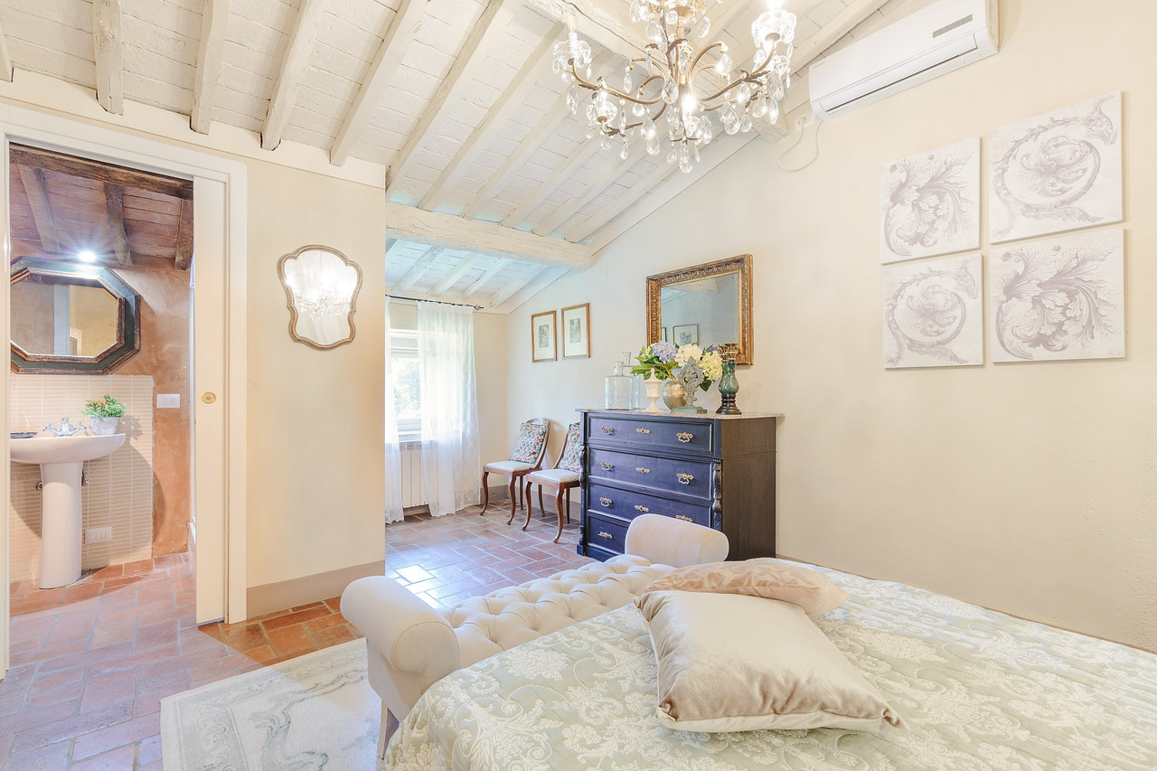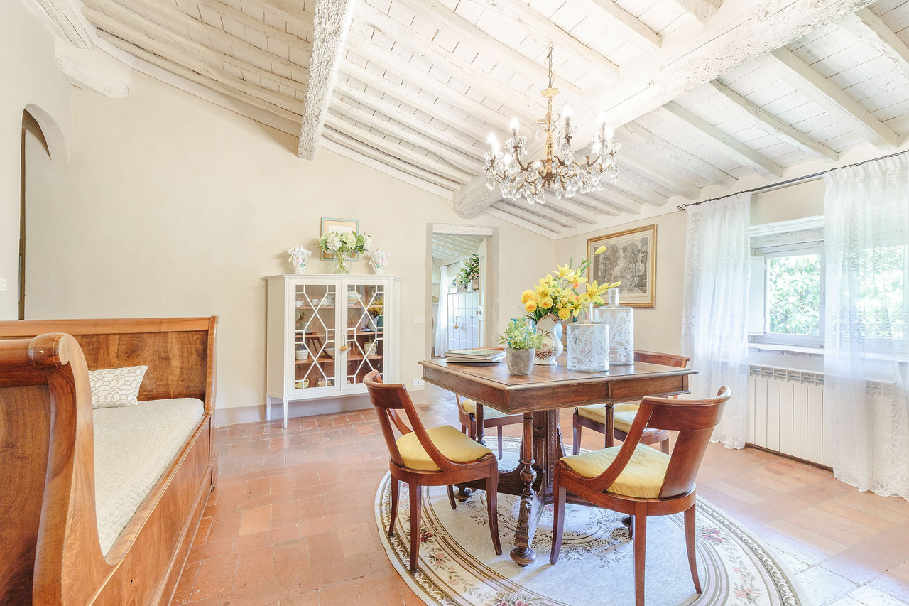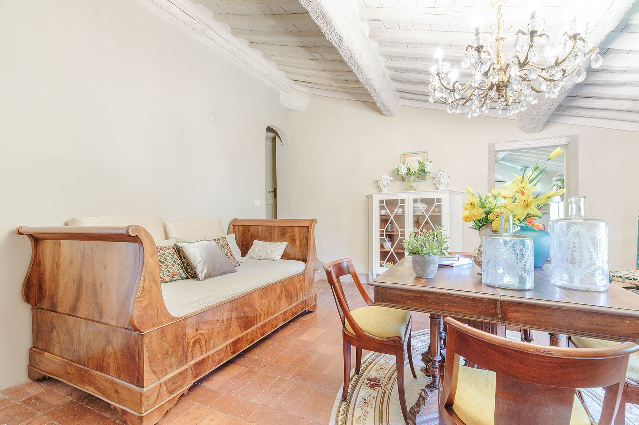 This charming house located on the outskirts of Lucca will be your new favorite. Extremely well maintained, you will discover inside a mix between baroque and contemporary. This alliance gives the house an atmosphere so warm that we would like to enjoy it indefinitely. Here and there, you will find some typical Tuscan elements: exposed beams and terracotta floors have been preserved to bring that touch of authenticity that we love in Tuscany. With its very high ceilings, one might think of this villa that it looks like a castle. This impression is also underlined by the very elaborate gilding and chandeliers that adorn each room. All these luxurious details come from the noble family who decided to build this house in the 17th century.