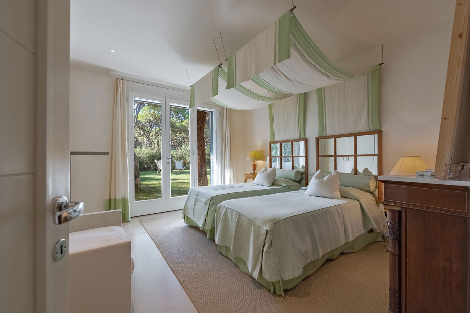 Double bedroom with garden view, air conditioning and Independant Bathroom access from corridor