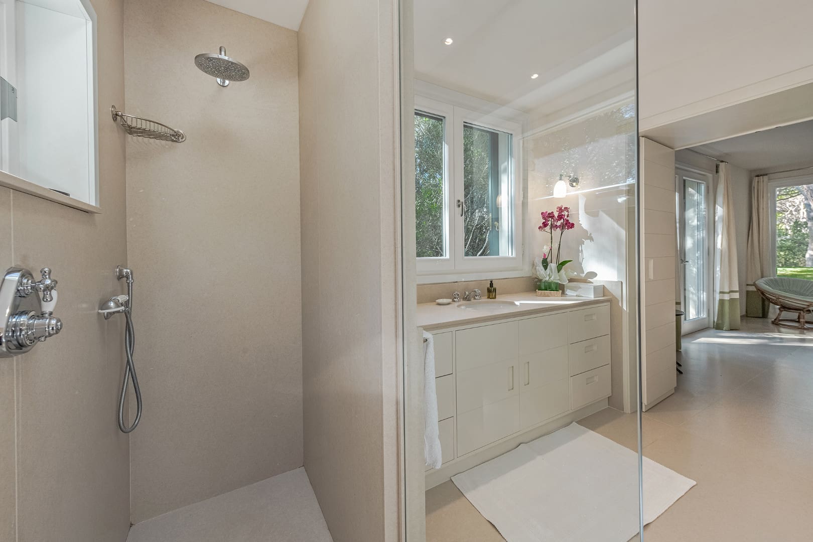 Double bedroom with garden view, air conditioning and Independant Bathroom access from corridor with shower