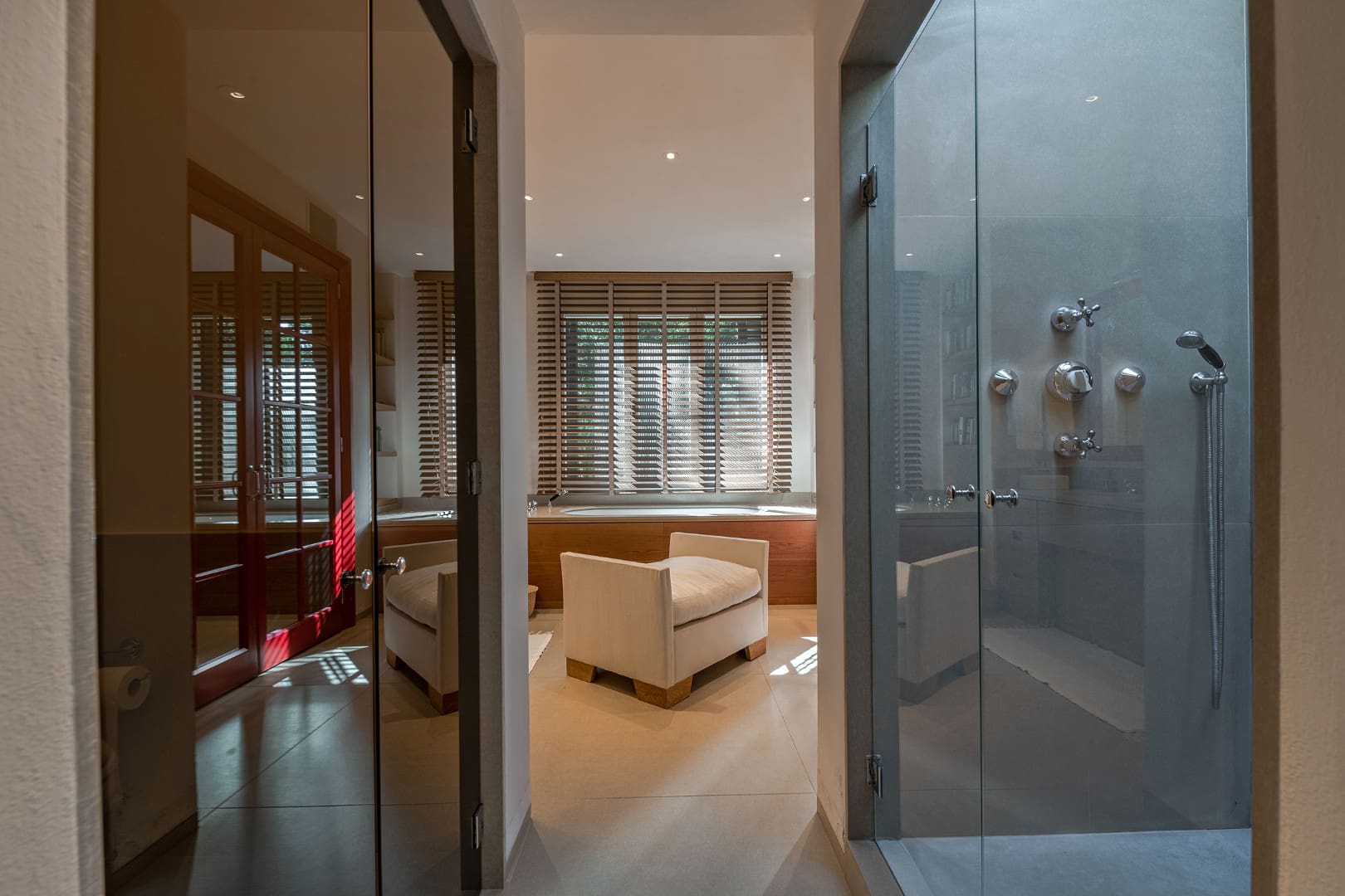 Master bedroom with office corner, living room area, garden view, air conditioning and Ensuite bathroom with bath, shower