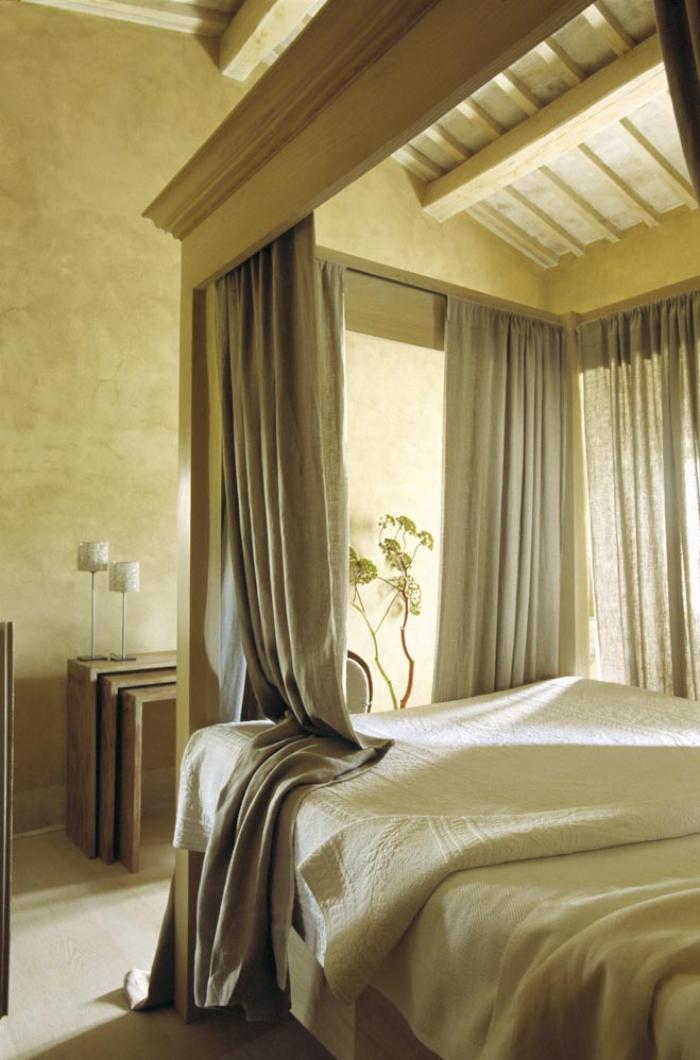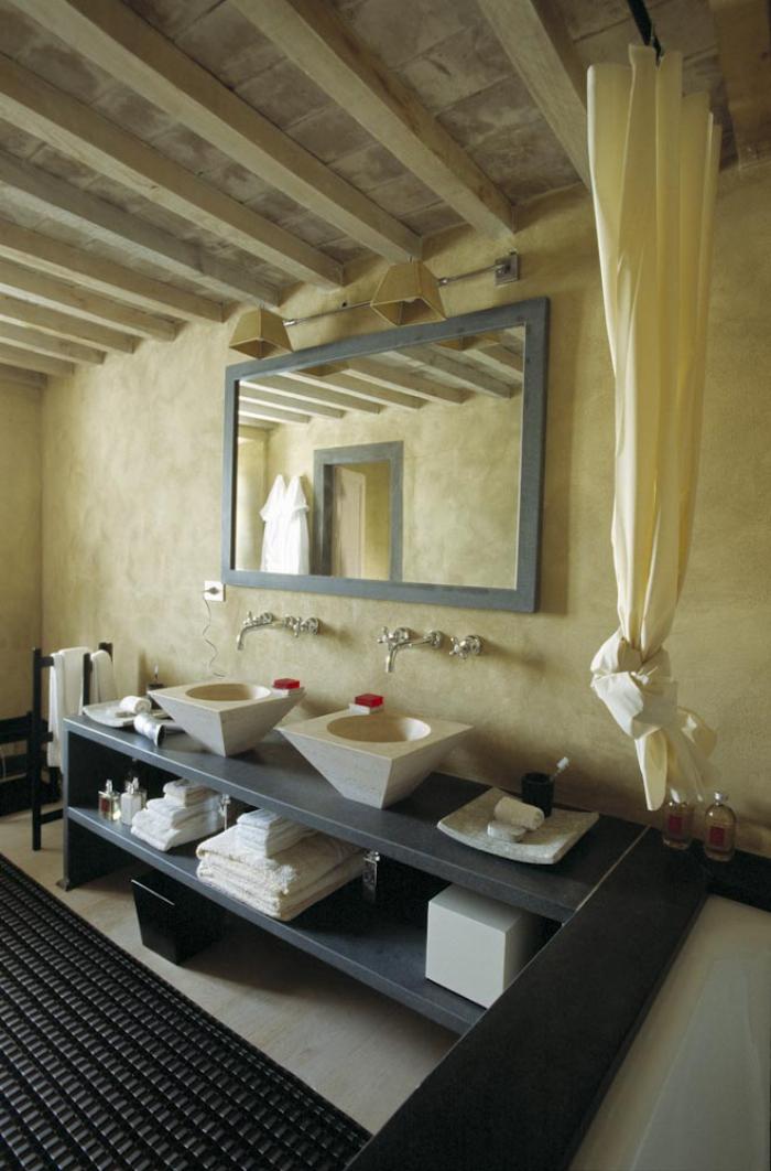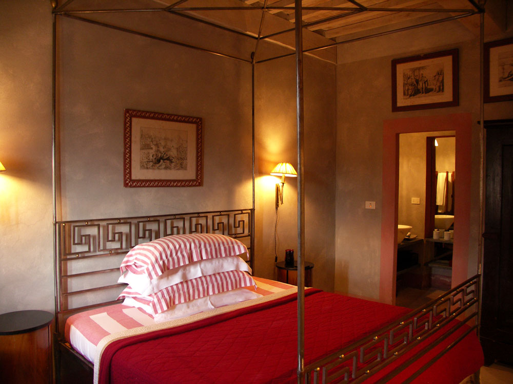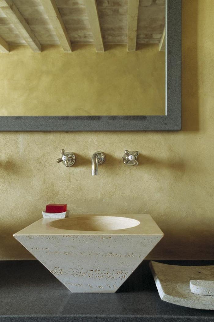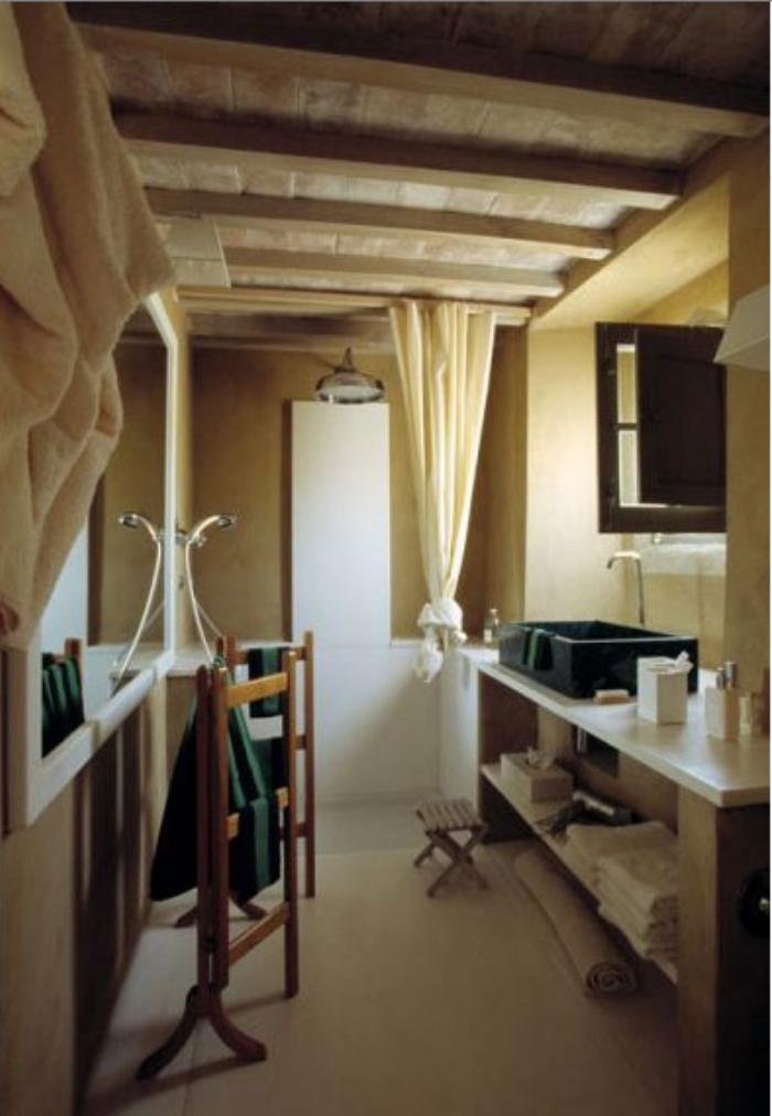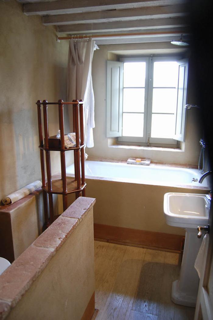 A wide, uncovered staircase that leads to the first floor bisects two broad terraces paved with old stones. One forms an outdoor living room with casual seating under umbrellas. The second is the outdoor dining room, also under umbrellas. Close by is the outdoor fireplace for grilling in the ancient Tuscan tradition and fashioned from thick slabs of “pietra serena”. The sink is wide and shallow and ancient. All has been thought to enjoy the Dolce Vita.