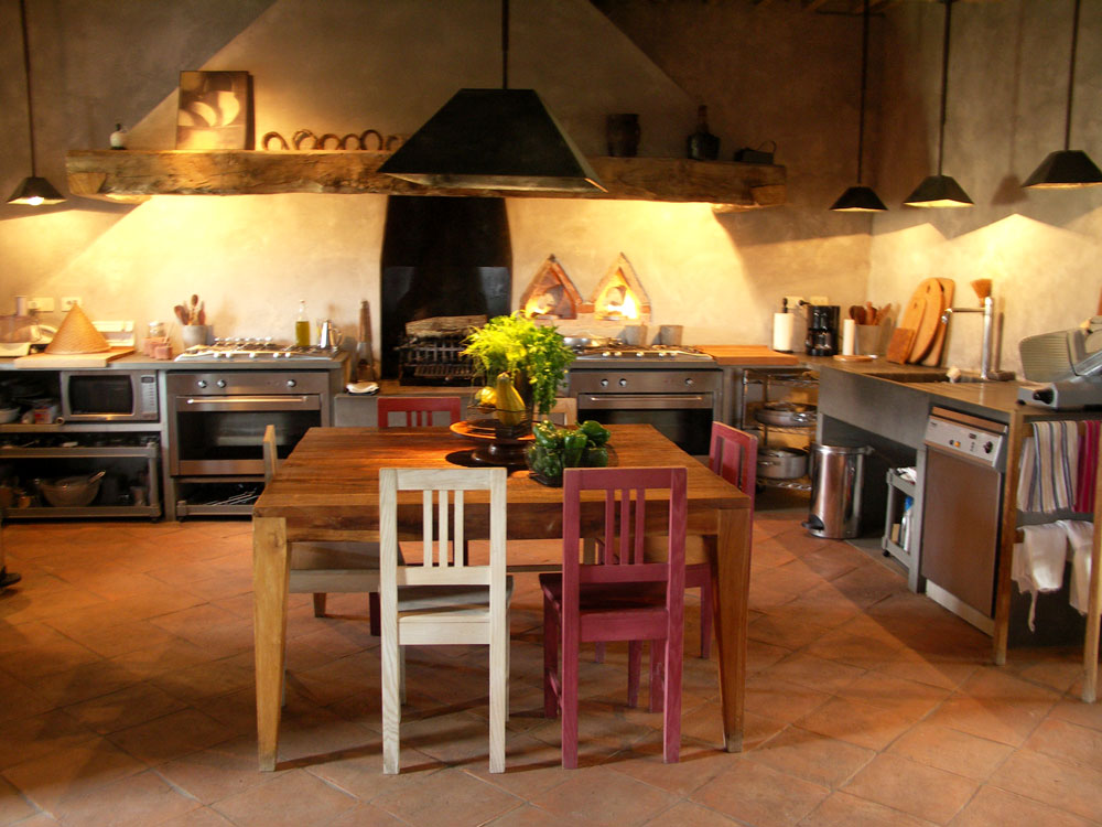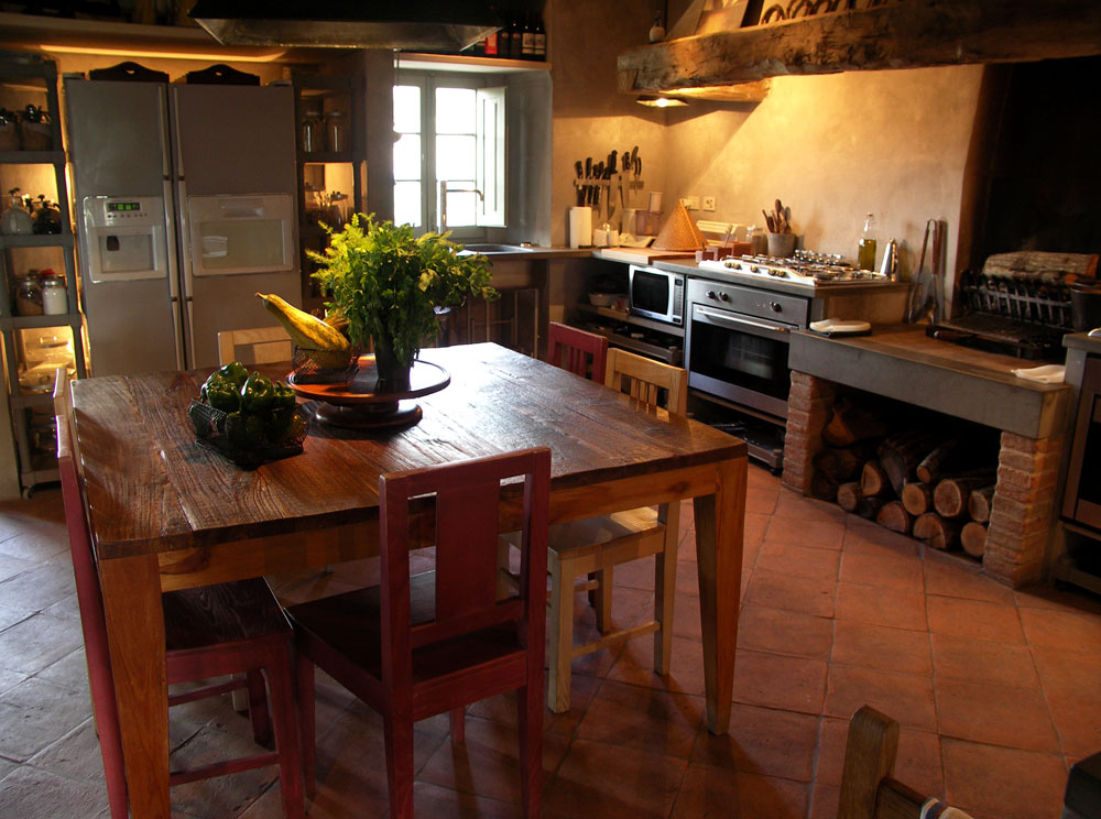 Kitchen with dining area great hearth (3 meters large) for grilling and central table for 12 persons with microwave oven, fridge, ice making machine, gas oven, gas stove
