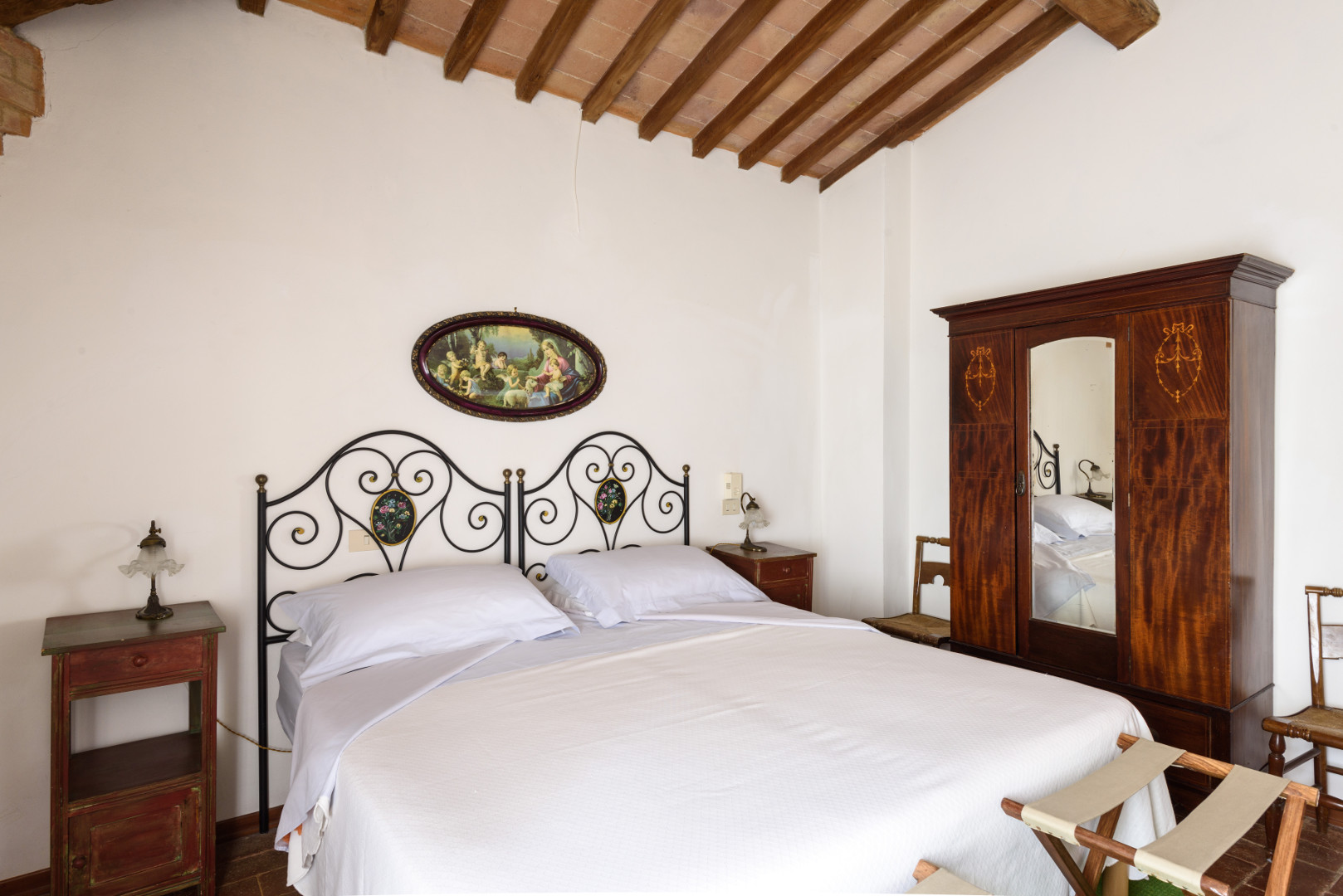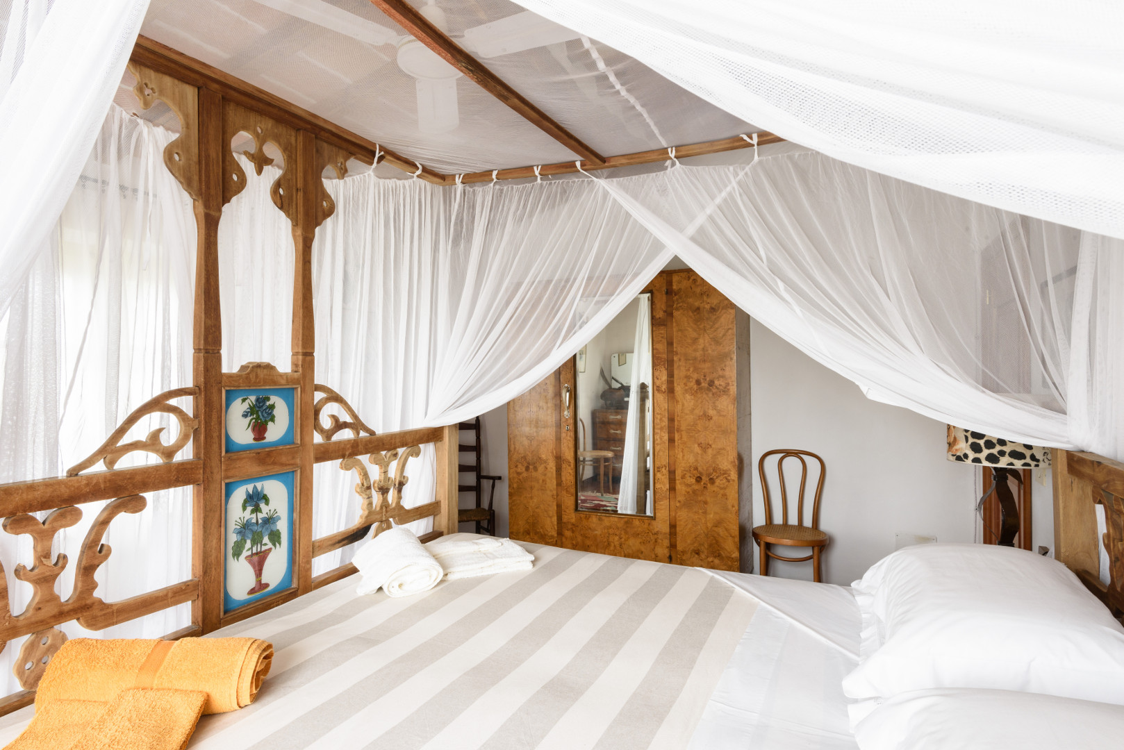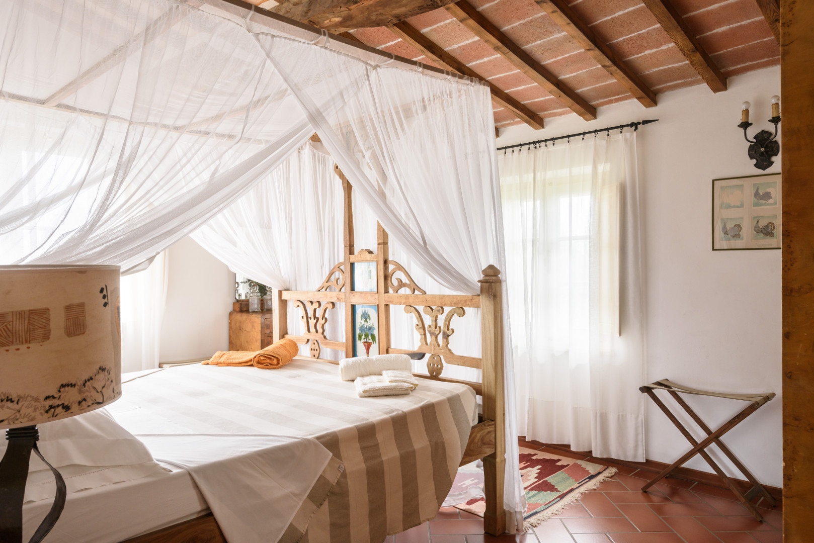 Double bedroom style zanzibar with wiev on Siena and Crète Senesi with king-size bed, fans and Independant Bathroom with bath, hair dryer