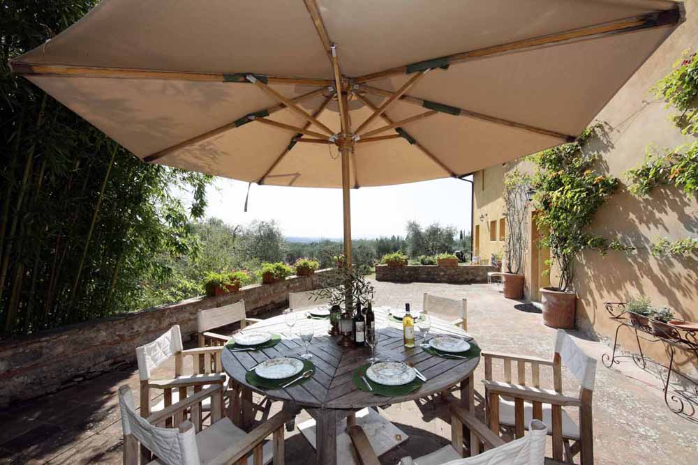 Equipped Terrace extending along the east side of the villa. It is paved in terra cotta, and set with large table and canvas umbrella for dining al fresco with sun umbrella