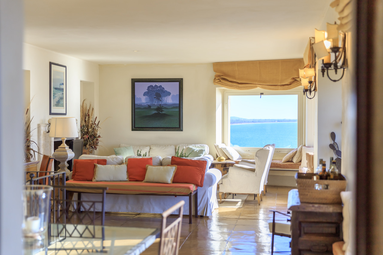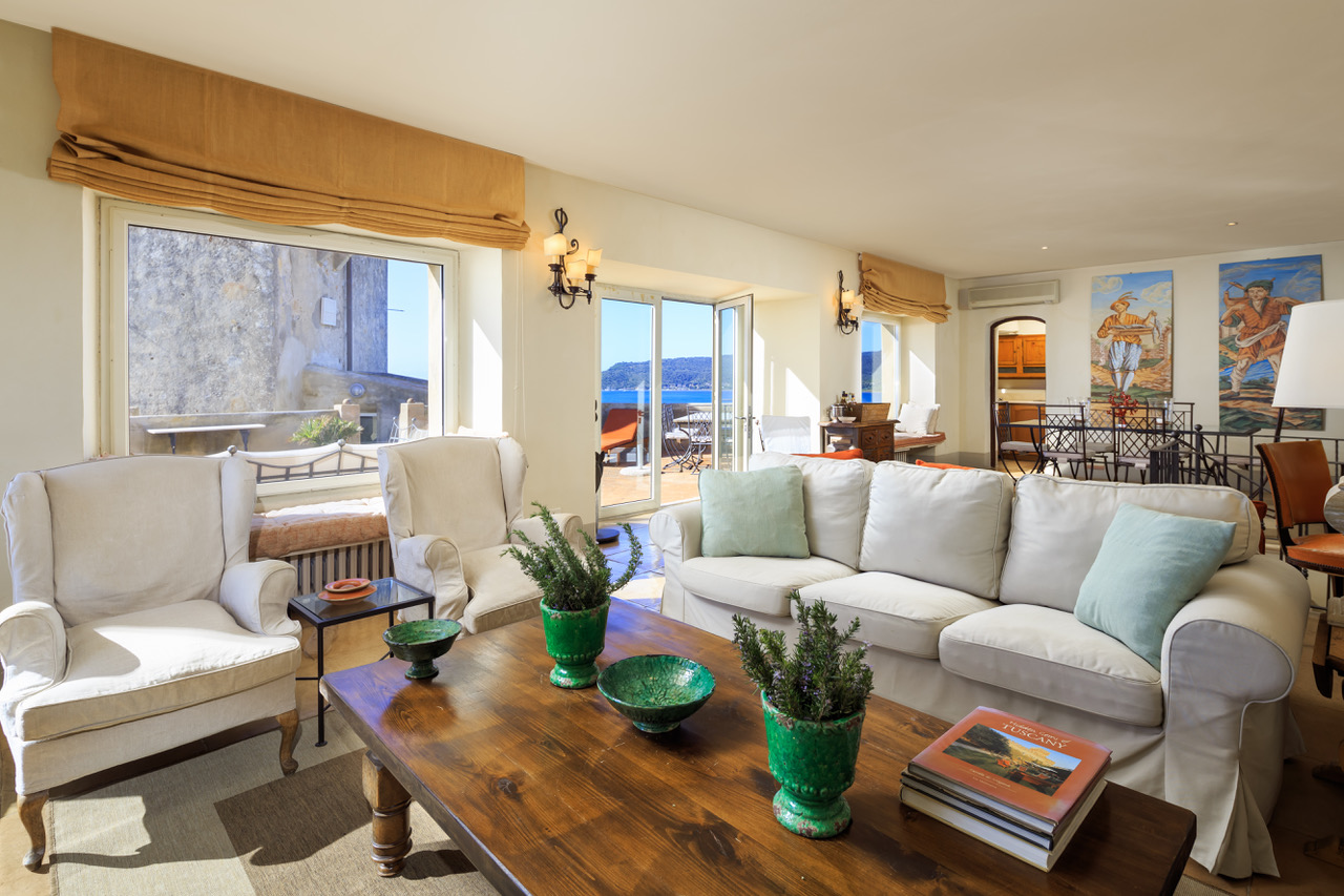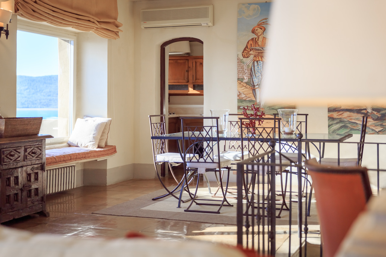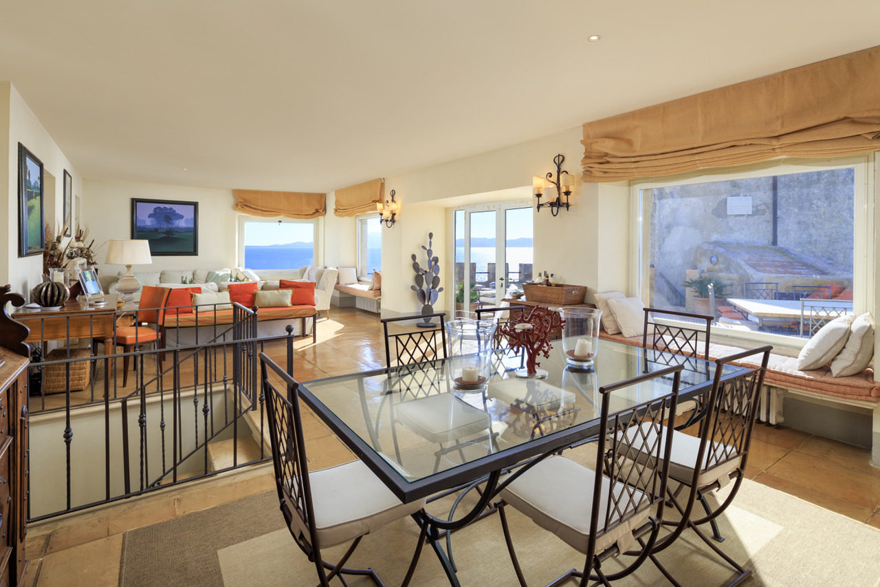 Living Room large and bright furnished with air conditioning, dining area with wonderful views on the shore with air conditioning, terrace access, fire place, sea view and Equipped Terrace with sea view