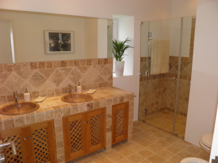 Double bedroom with terrace access and Ensuite bathroom with shower, bath, double sink