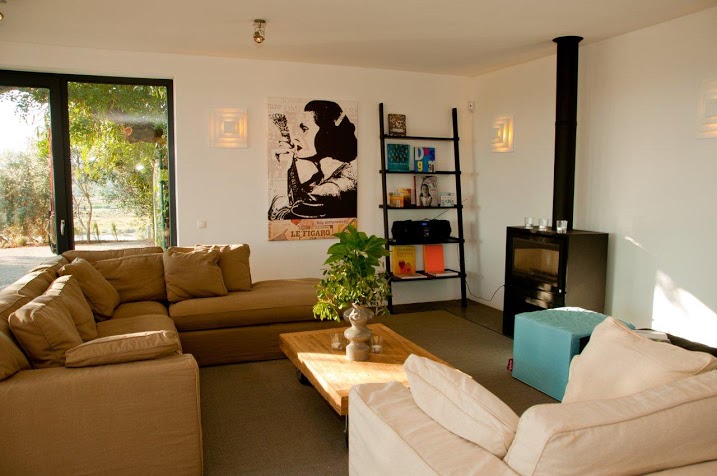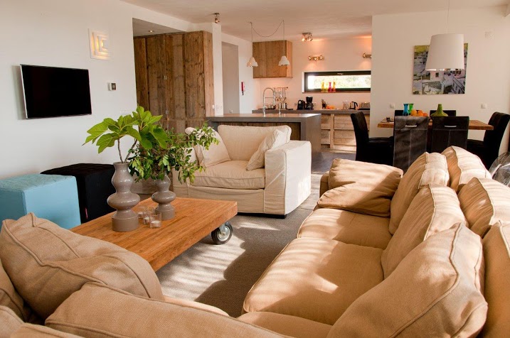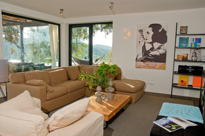 Living Room with dining area with large windows. Doors lead to the various terraces that surround the villa, all offering magnificient views at the countryside.