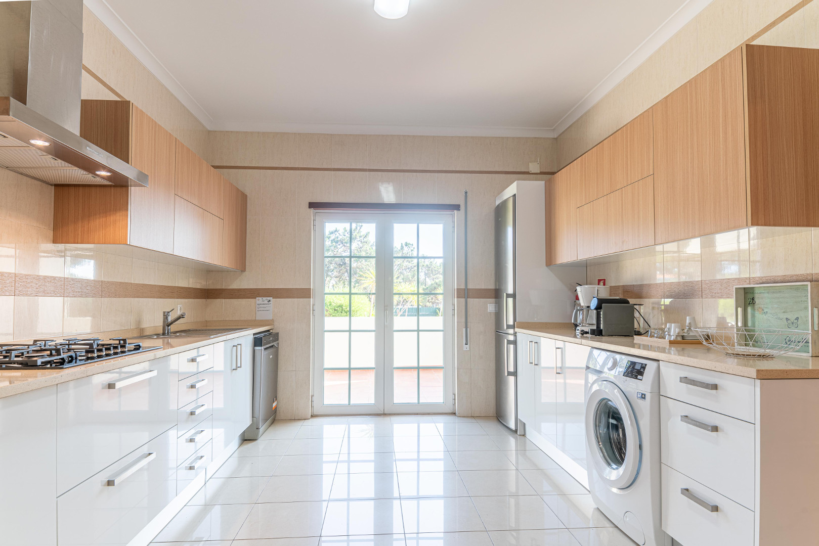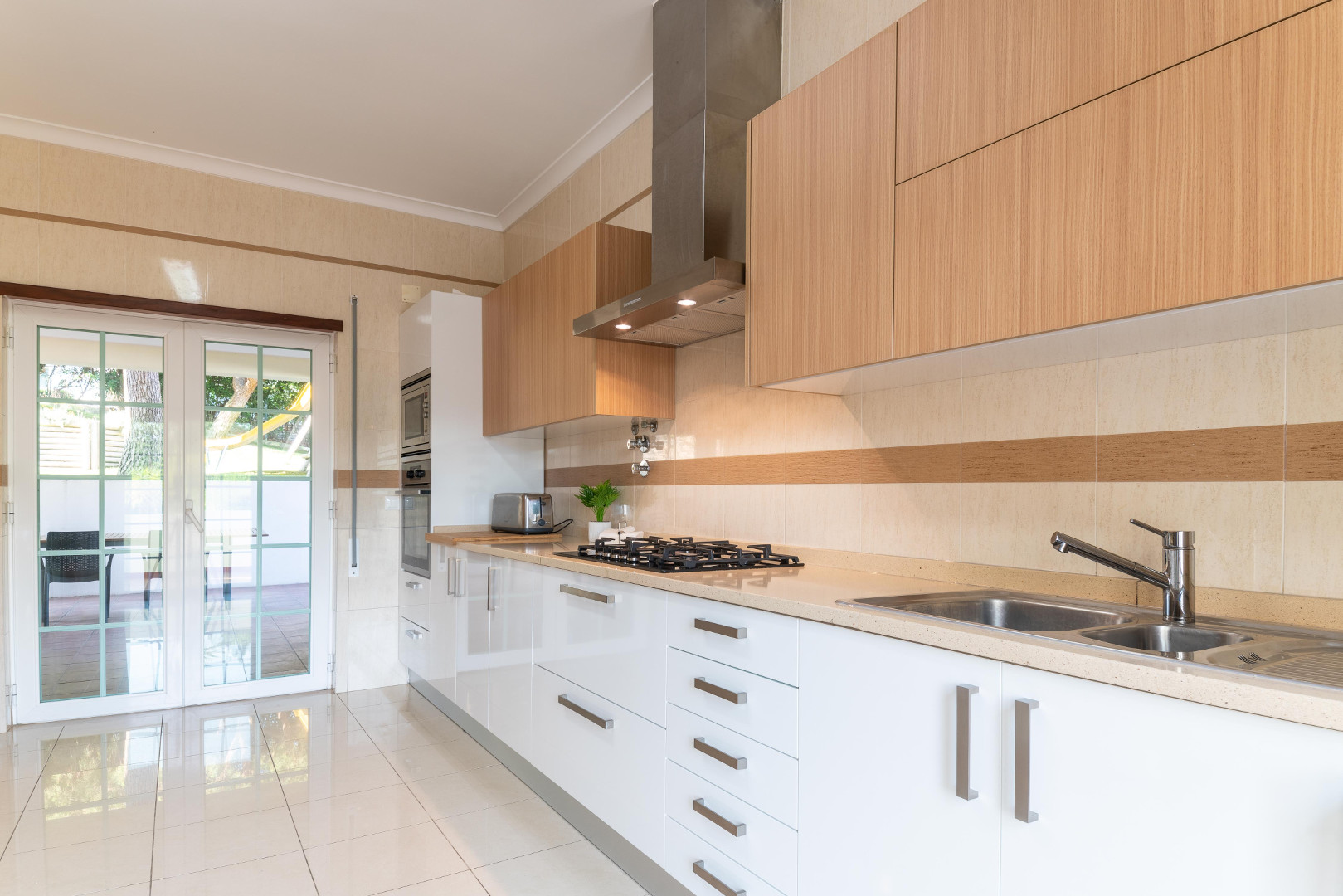 Open kitchen fully equipped with balcony facing the swimming-pool with terrace access