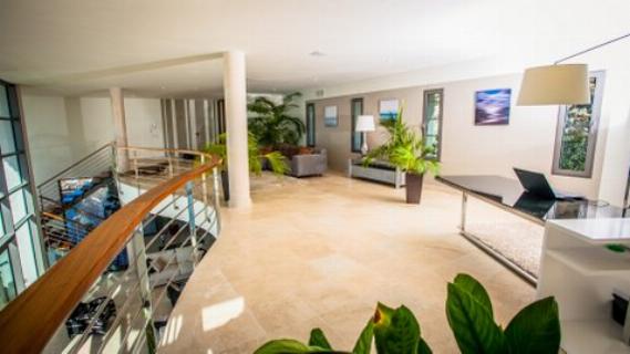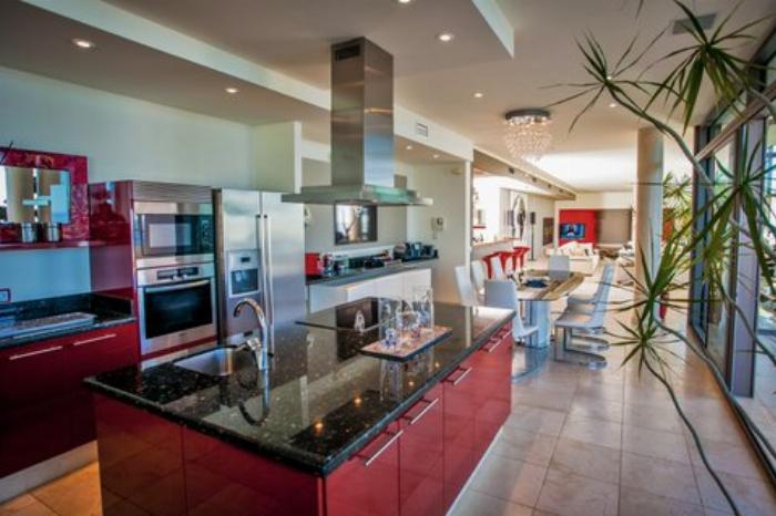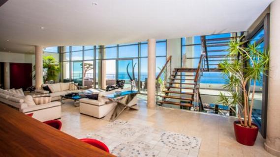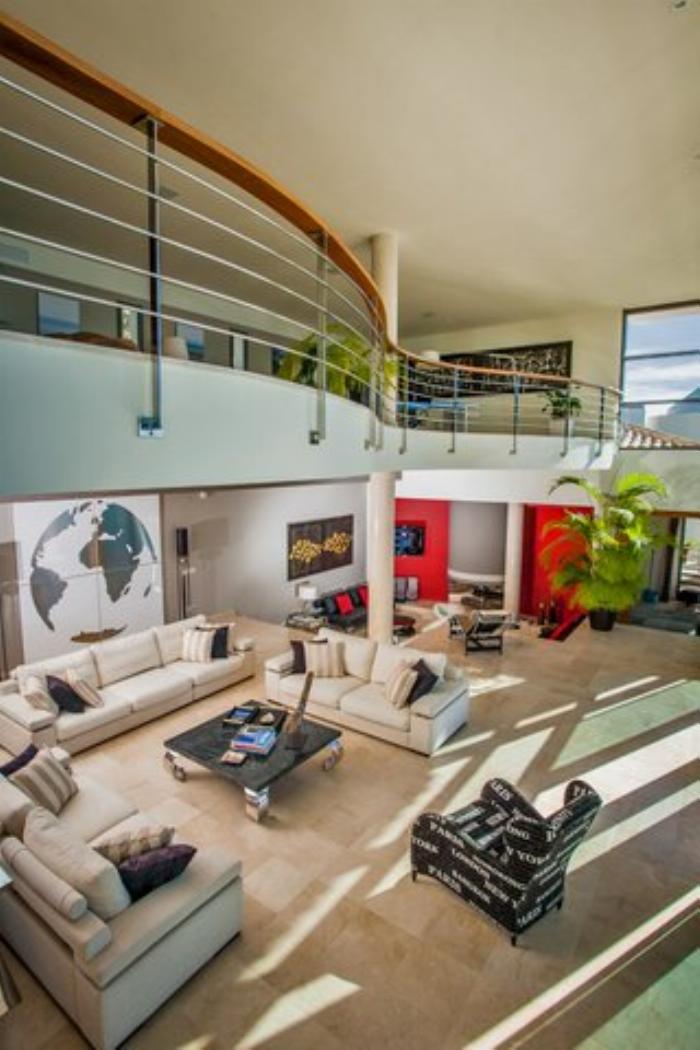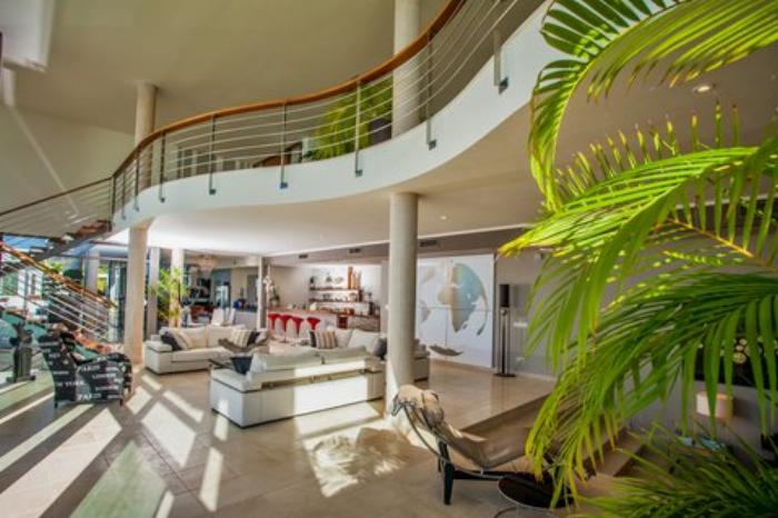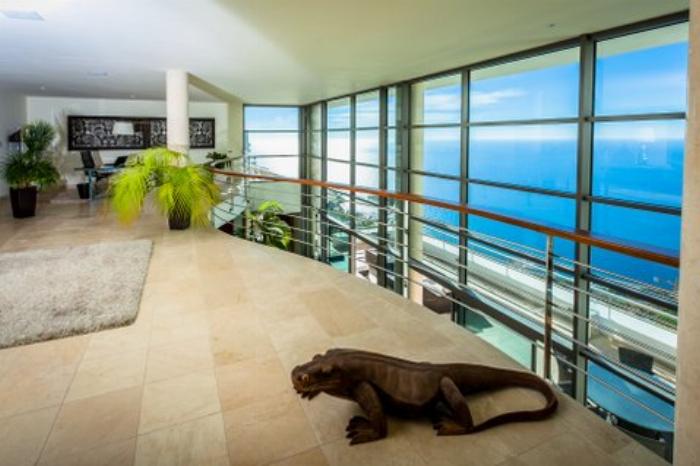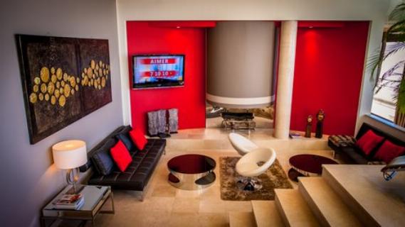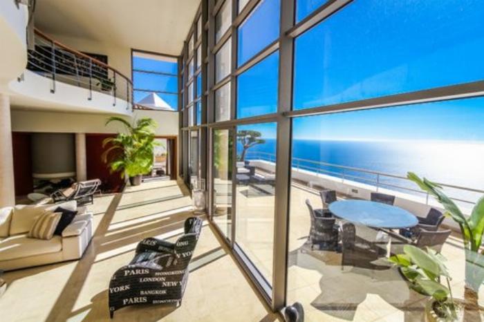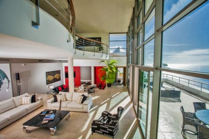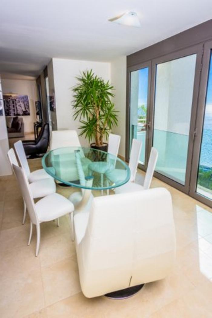 Living Room with dining area with bar, terrace access, pool view, sea view