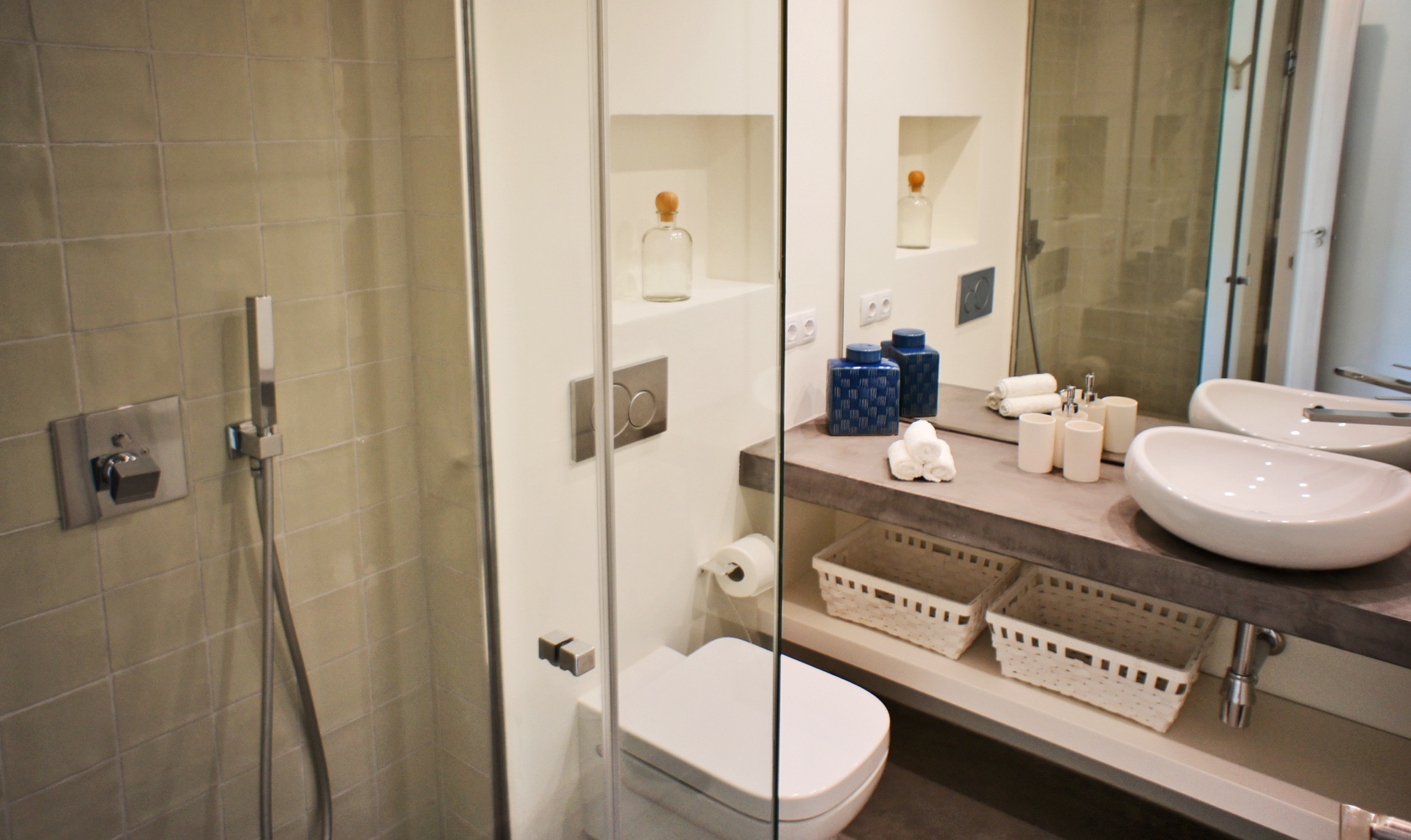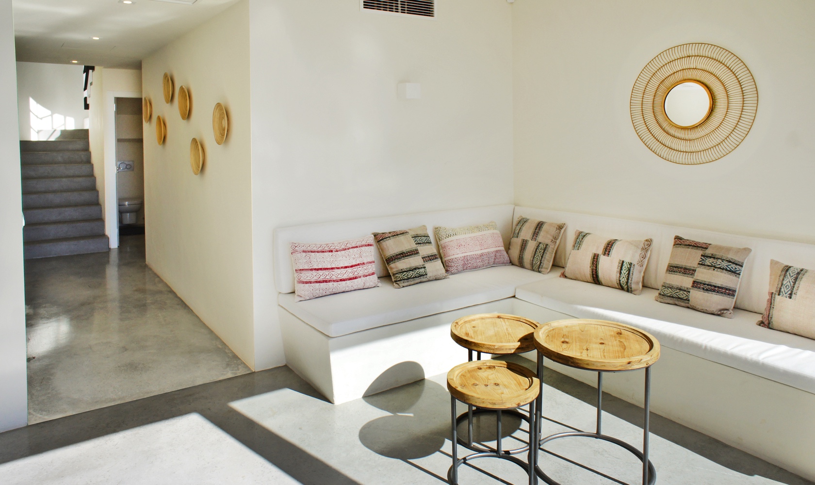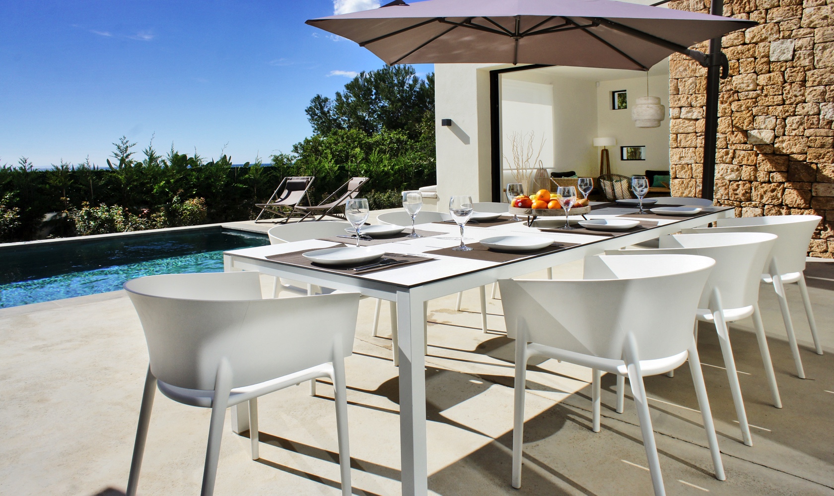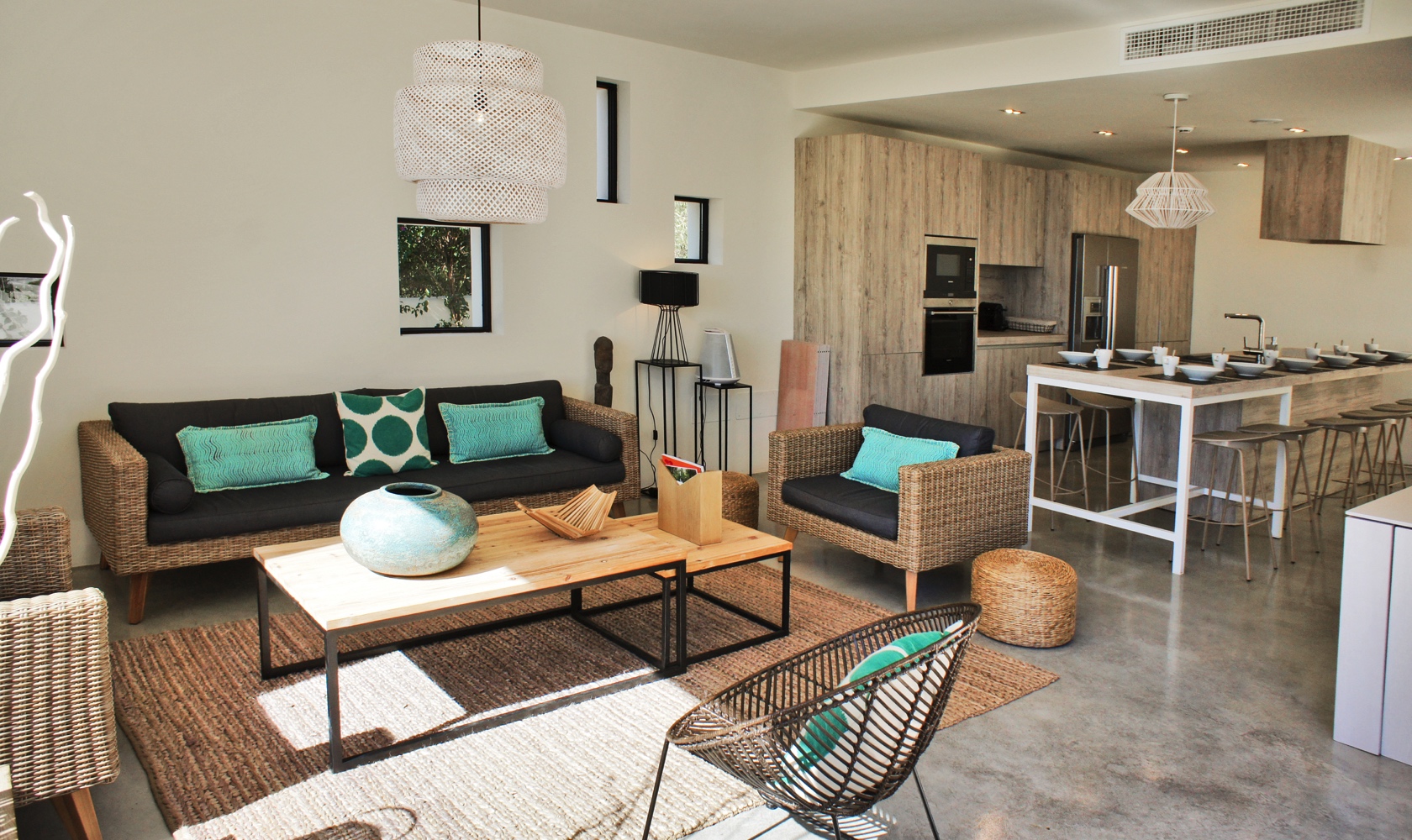 The inside is tastefully decorated always using the same palette of colors (white, beige, brown) which makes it an harmonious whole with the outside. Some touches of blue makes us think about the swimming pool or the shades of the sea situated just in front of the house. There is in this villa all the necessary comfort for holidays in the sun: air conditioning, outdoor table for meals, lounge area and a pool of 10 x 4 meters. The kitchen, with central island, will offer you friendly moments before to gather all together around the table on the terrace to taste the Spanish sweetness of life. According to your desire of the day, choose your favorite terrace: the one at the ground floor, to enjoy the swimming pool and then relax on a sunbed; or the one at the first floor, nicely furnished with large cushions, chairs and low tables, to savour a drink at the end of the day looking at the beautiful light of the golden hour.