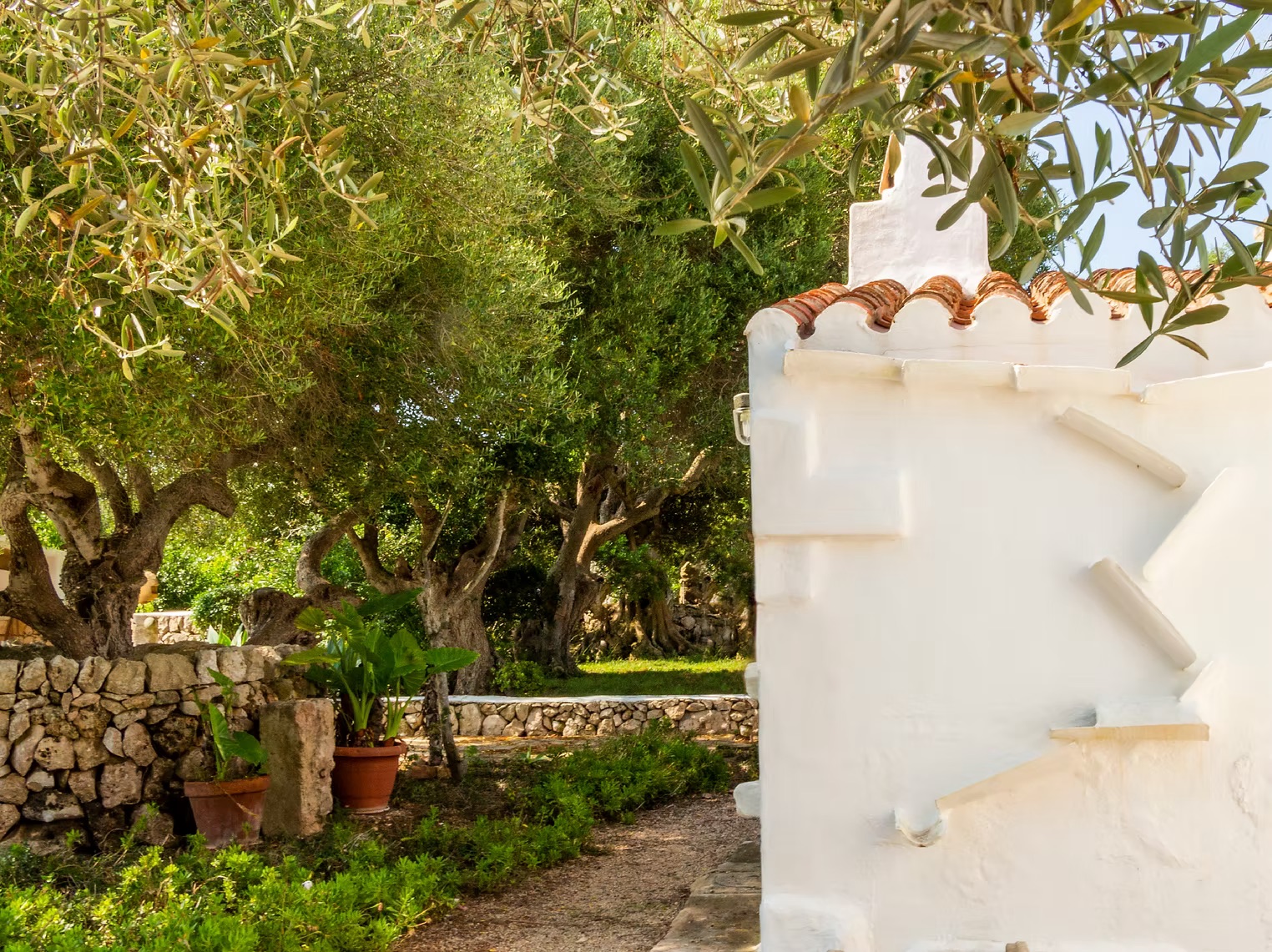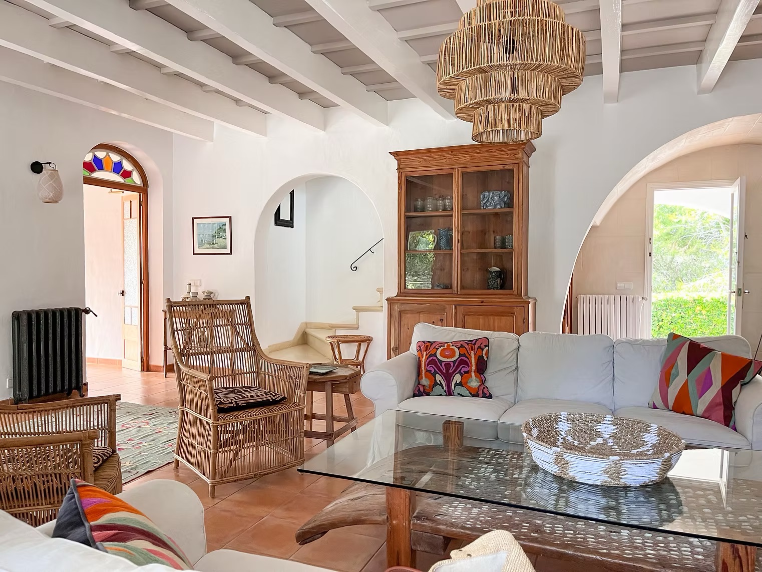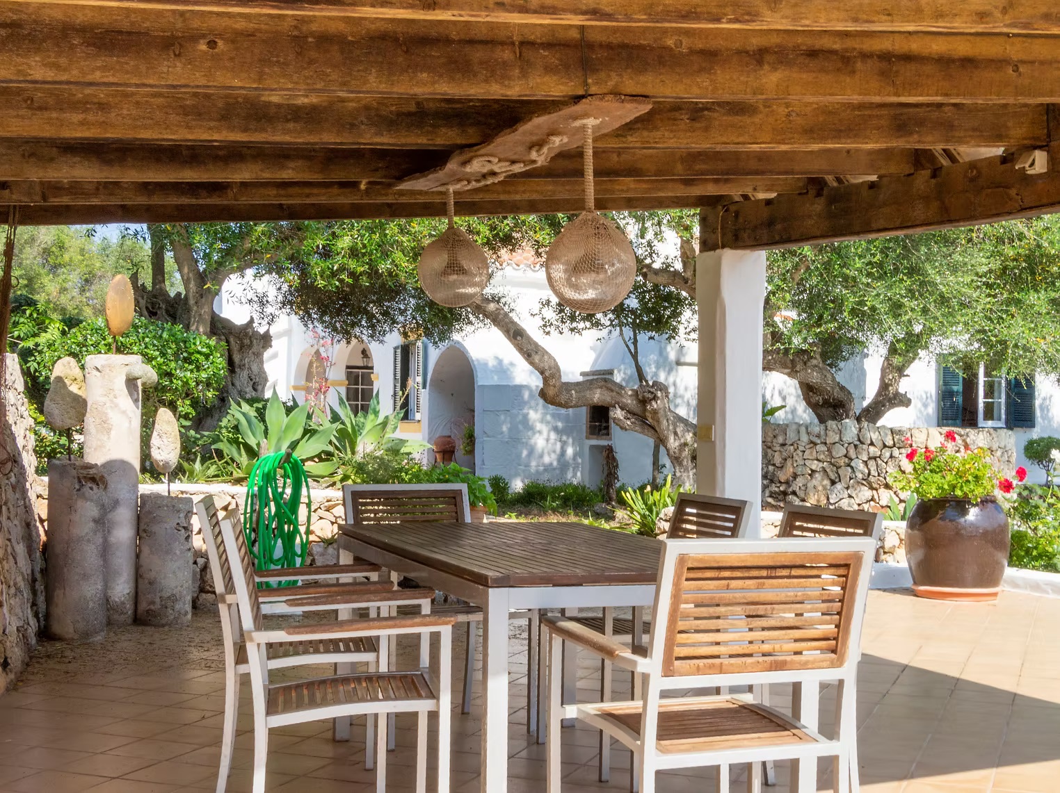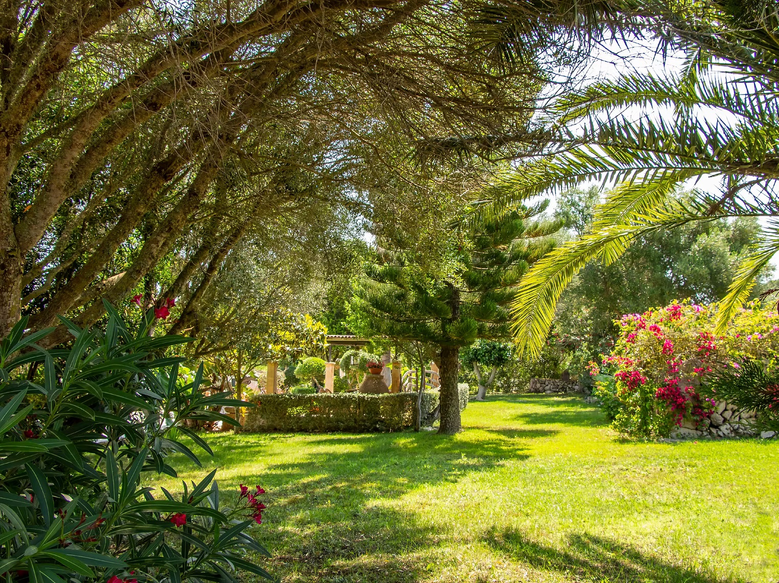 The property features a large garden of approximately 11,000 m² with mature trees, lawn areas and several spots to walk or relax in the sun or shade, as well as spaces where children can play. The pool, surrounded by terraces, is located next to a covered area for outdoor dining, and the house’s porch is fitted with traditional Menorcan built-in benches.