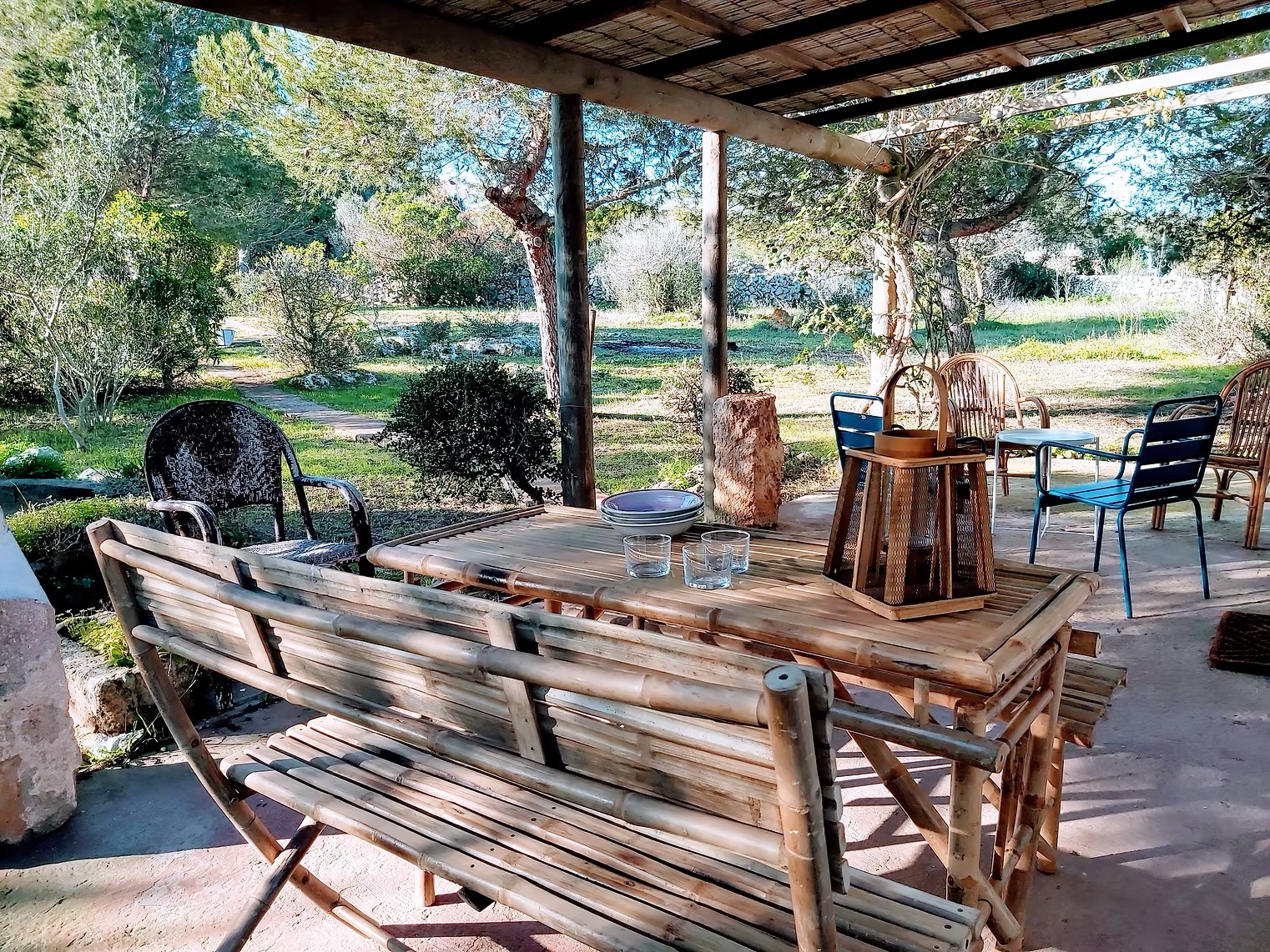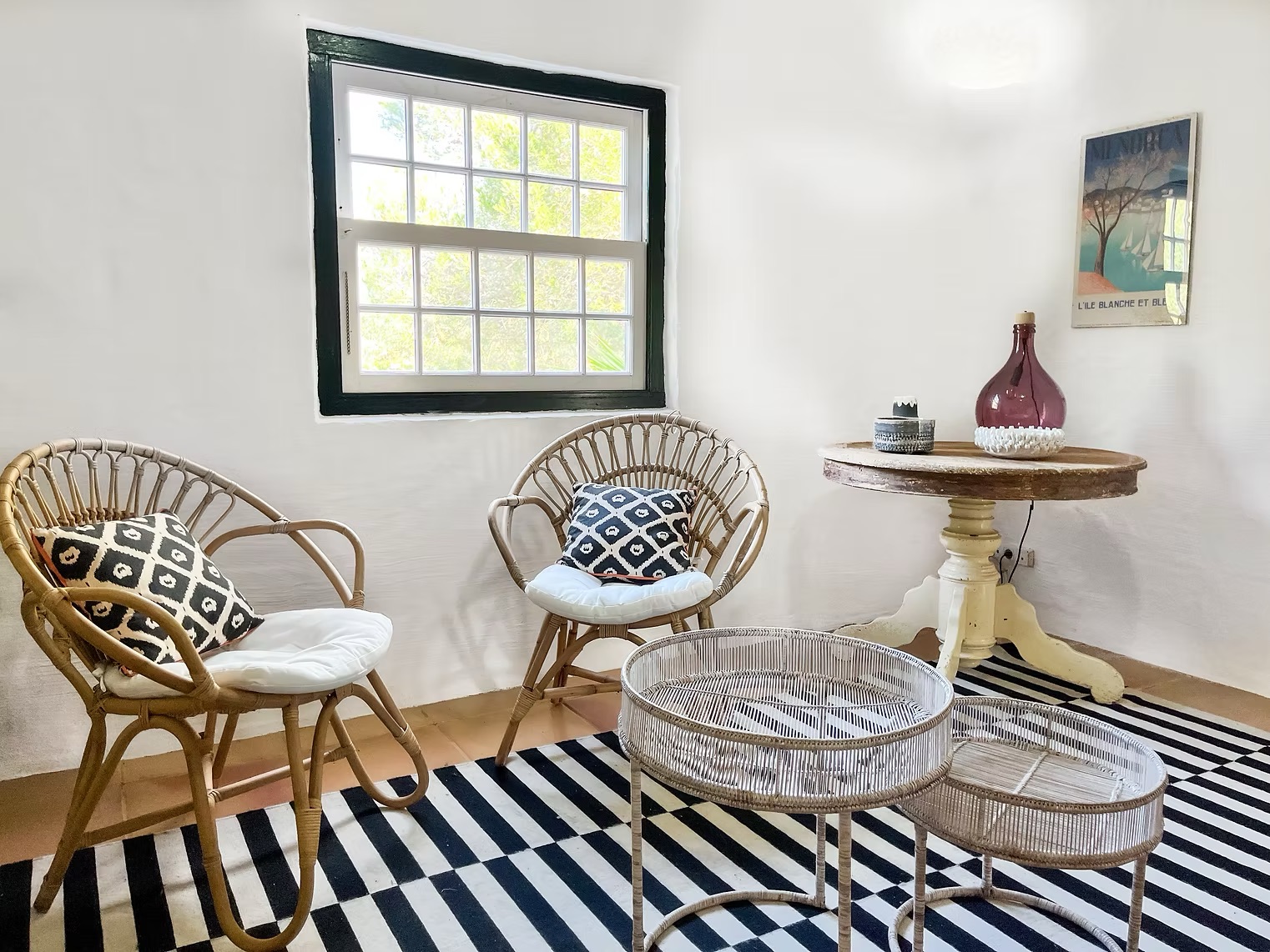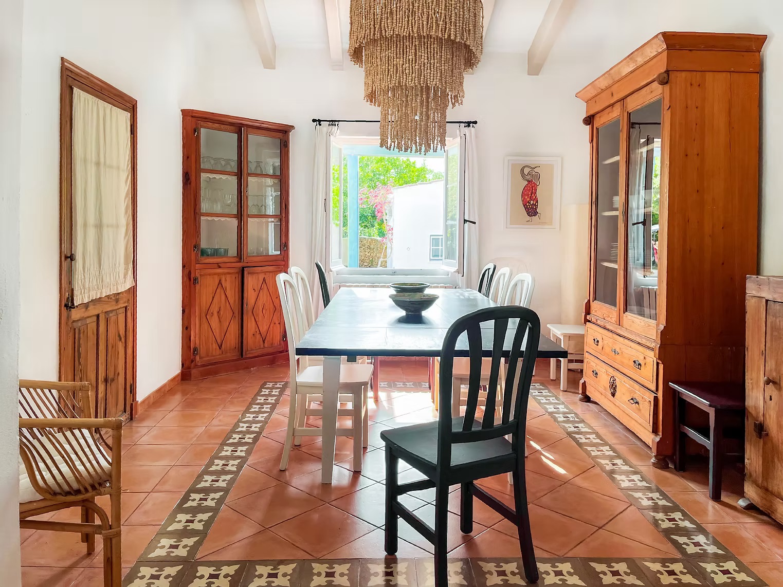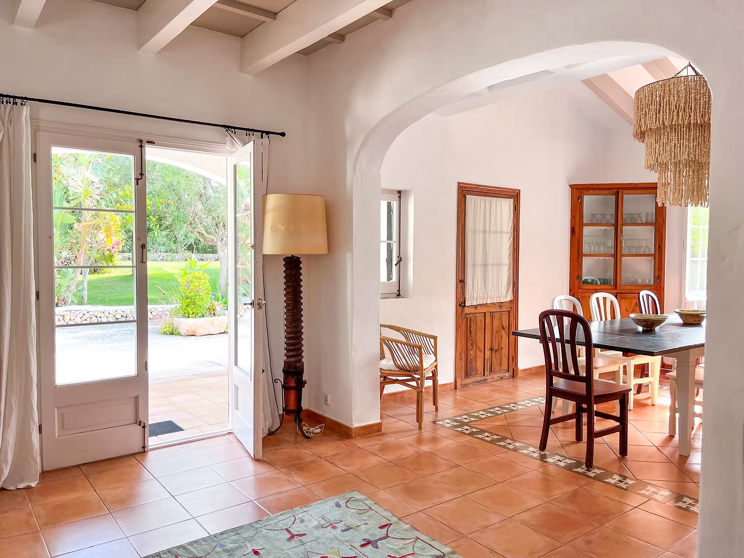 The property features a large garden of approximately 11,000 m² with mature trees, lawn areas and several spots to walk or relax in the sun or shade, as well as spaces where children can play. The pool, surrounded by terraces, is located next to a covered area for outdoor dining, and the house’s porch is fitted with traditional Menorcan built-in benches.
