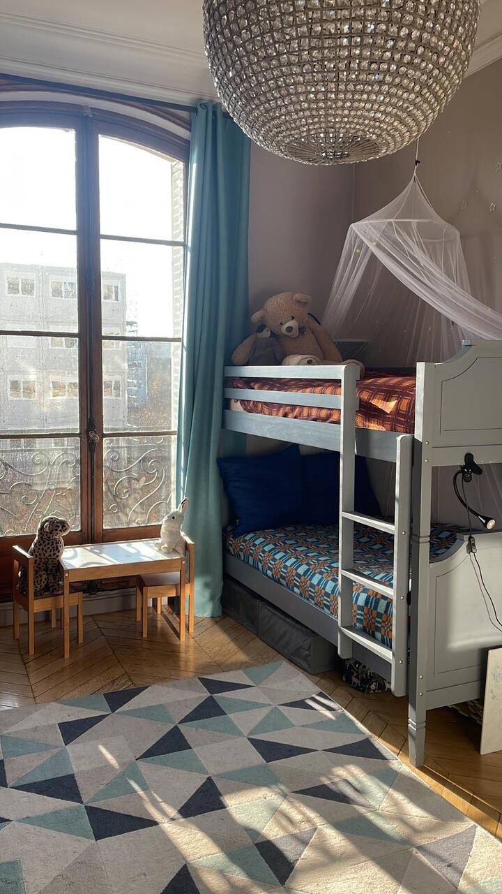 Chambre d’enfants à lits superposés de 190cm de long, avec vue sur Notre Dame