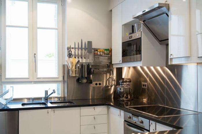 Cuisine professionnelle avec machine à expresso, lave vaisselle, réfrigérateur, congélateur, plaques à induction, four micro ondes, cafetière, bouilloire, four électrique