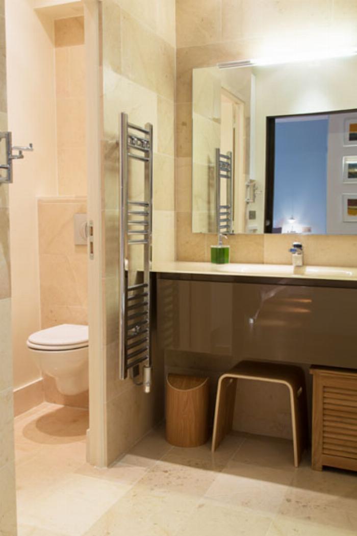 Chambre de Maître sur cour avec lit 180, télévision, coin bureau, dressing et Salle de Bain avec chauffe serviettes, douche, baignoire, wc, lavabo simple