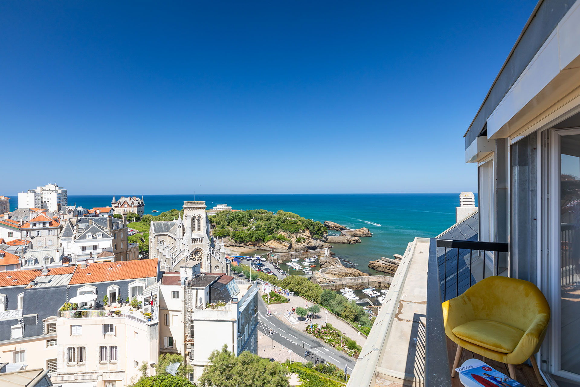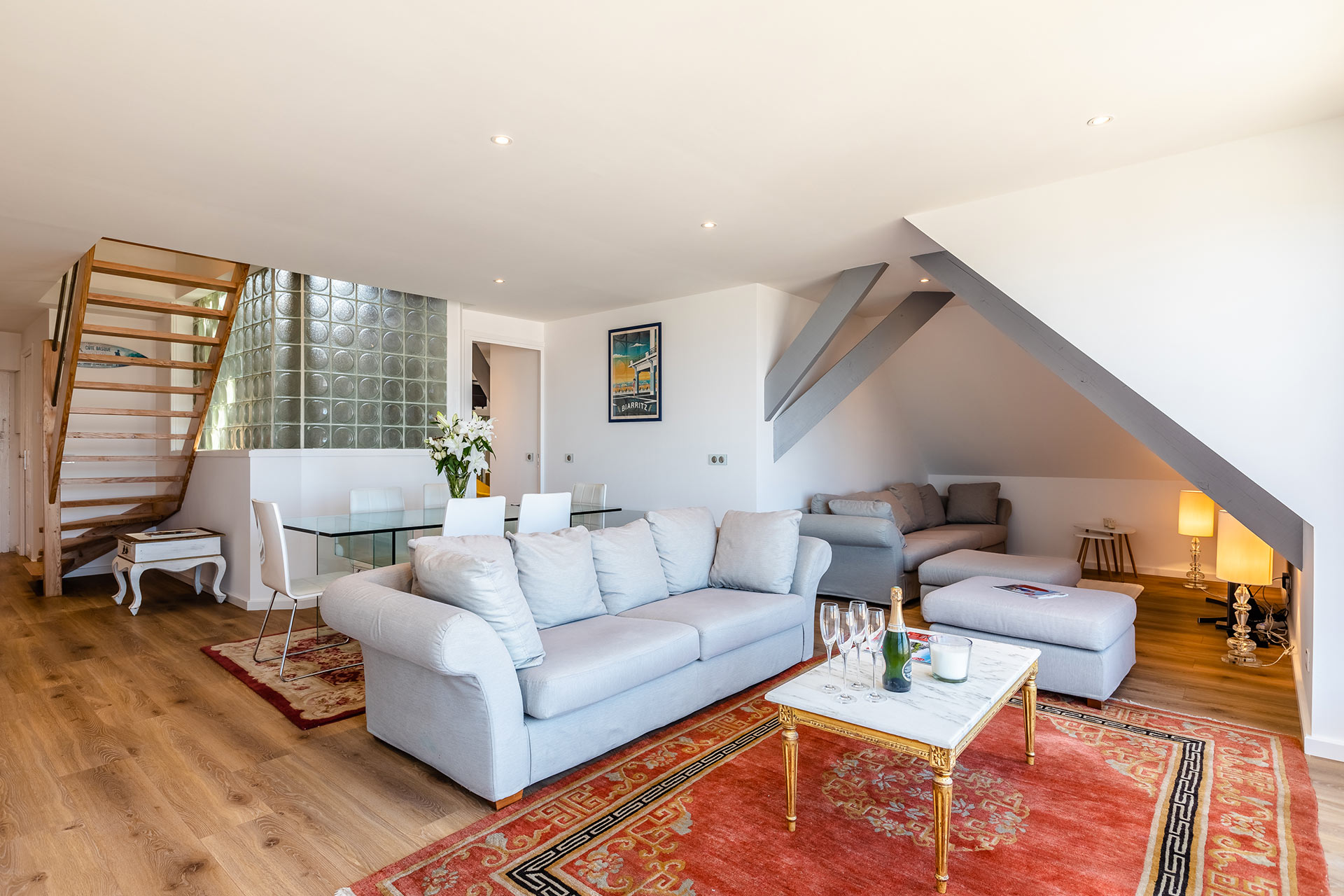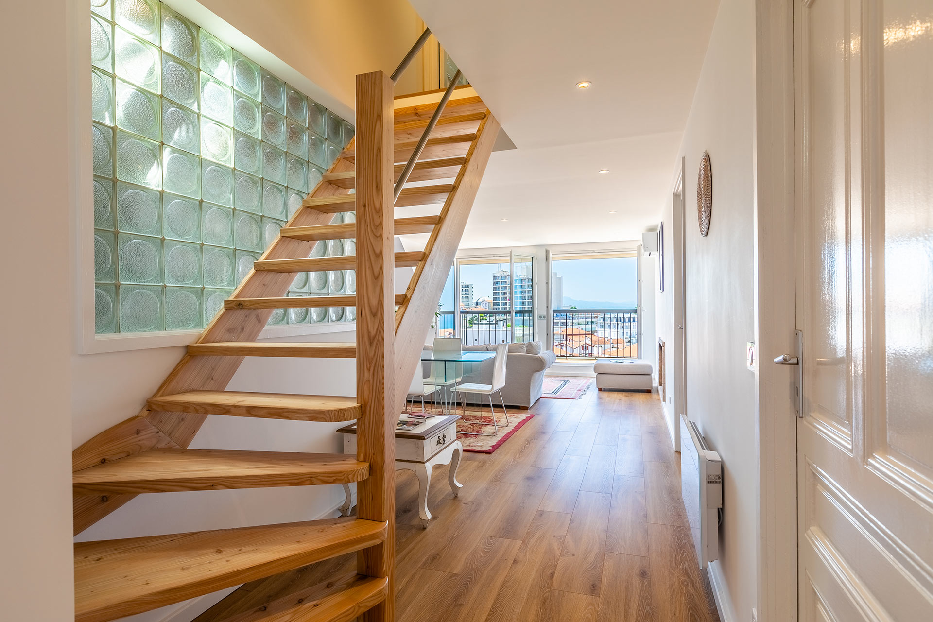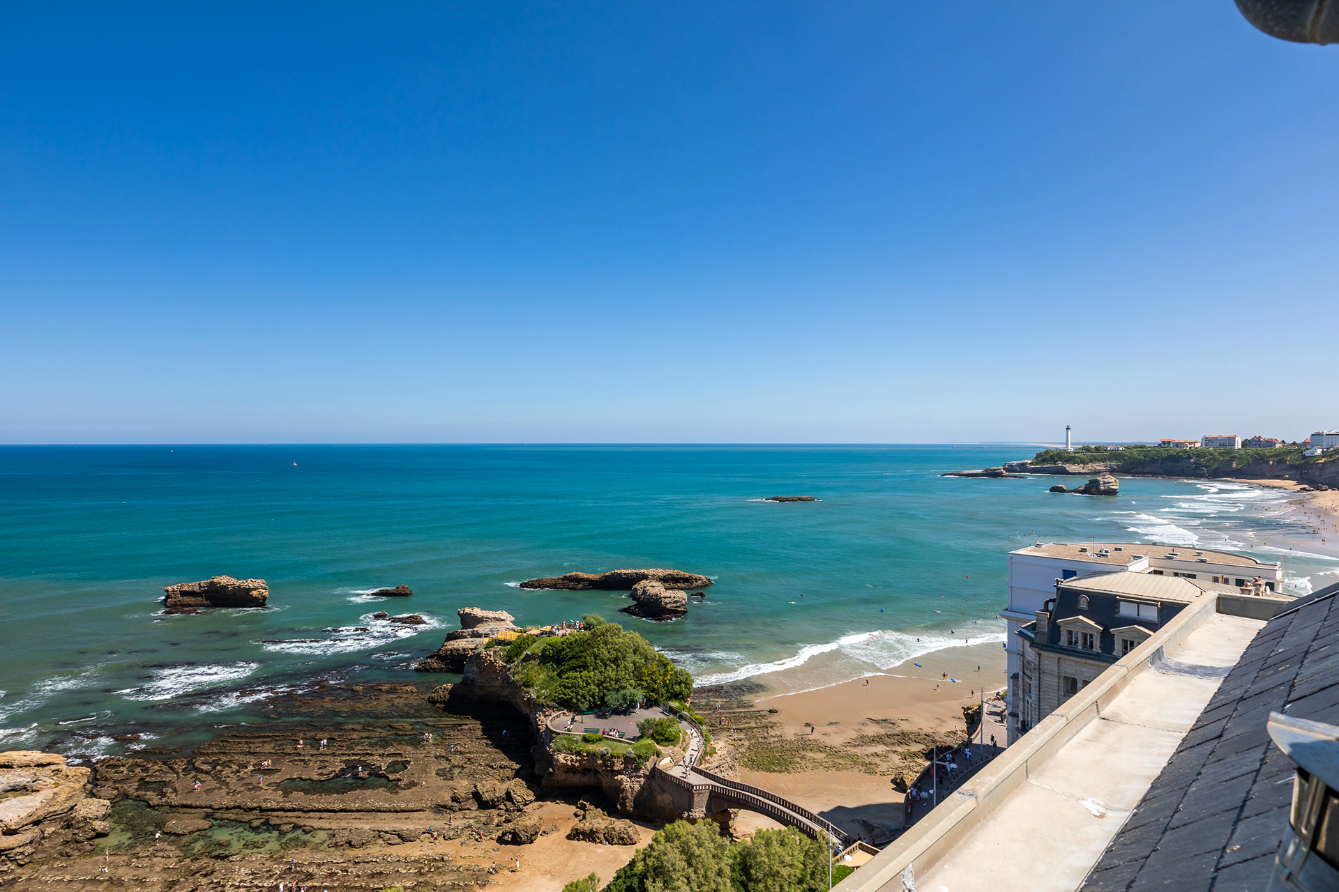 Au coeur du centre ville, près de la Grand plage de Biarritz, se trouve ce très bel appartement de 145 m2 situé au 5ième étage d’une résidence prestigieuse face à la mer. Sur 2 niveaux, mansardé, cet appartement lumineux a été aménagé avec beaucoup de gout.