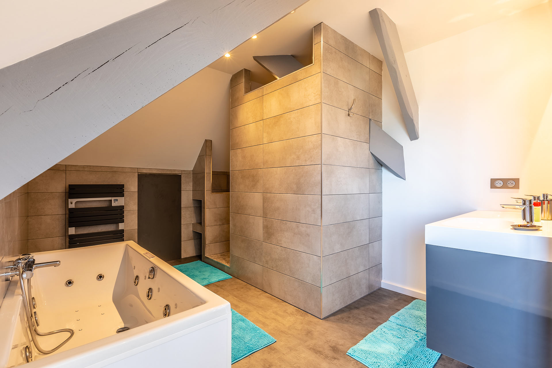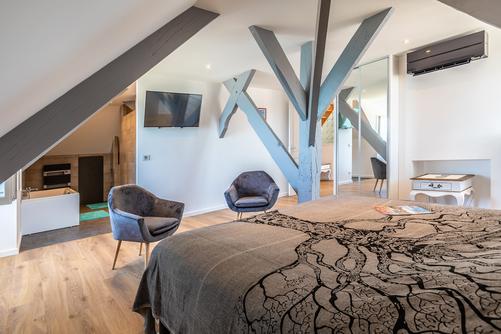 Chambre de Maître (1) avec vue mer, lit 180 et Salle de bain en suite avec douche, baignoire