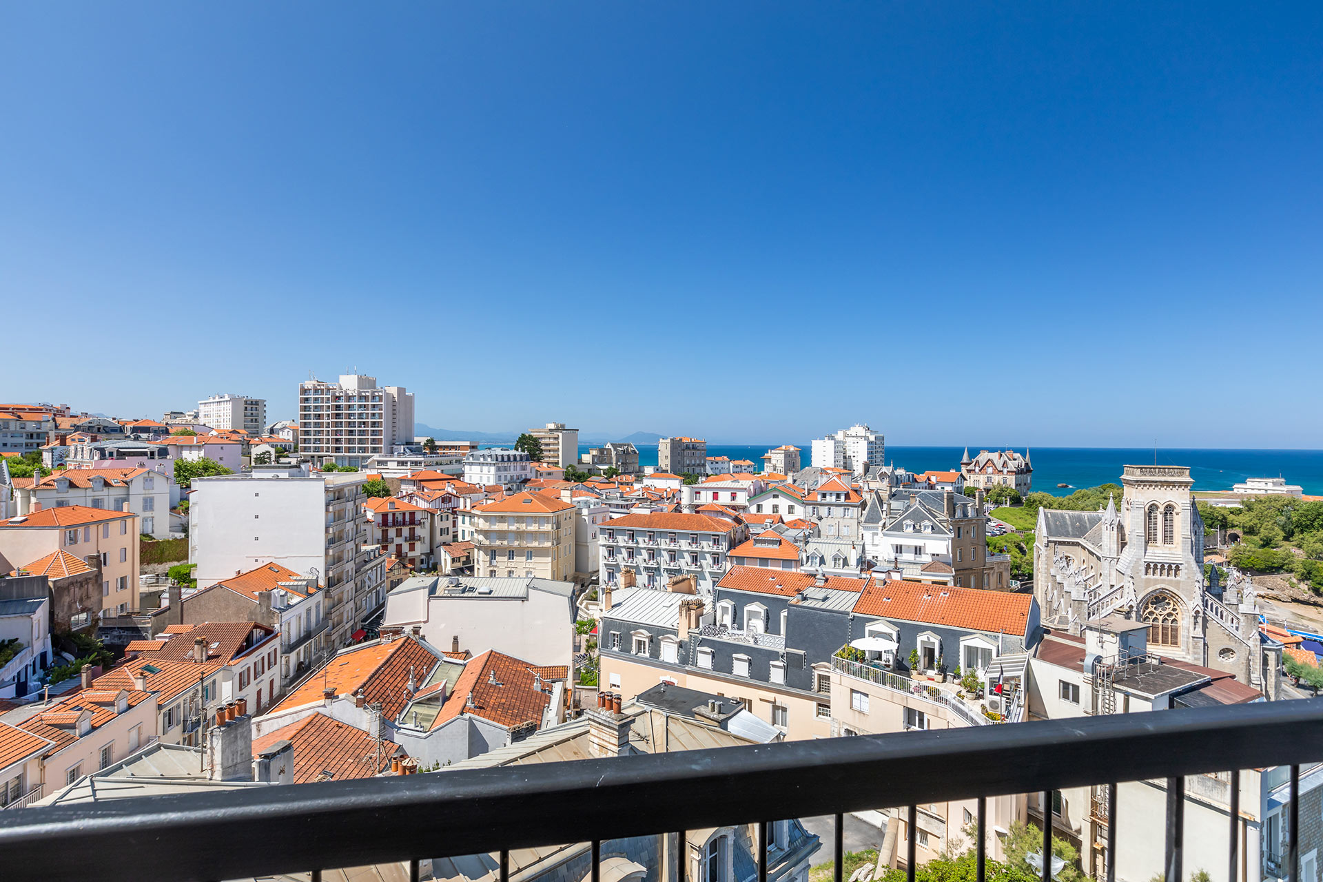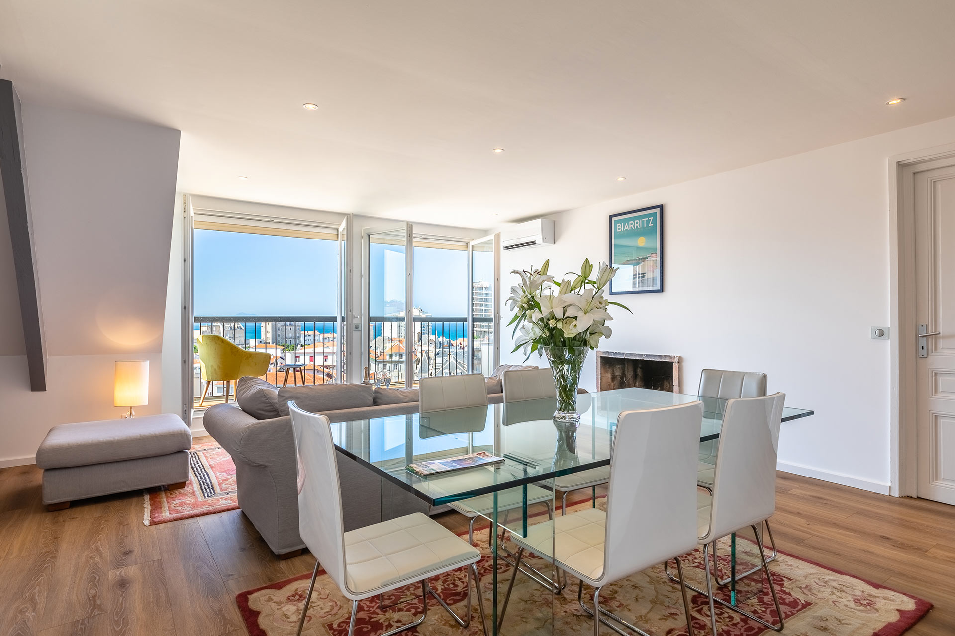Salon - salle à manger orienté sud ouest avec une magnifique vue sur Biarritz et l’océan avec la côte basque espagnole