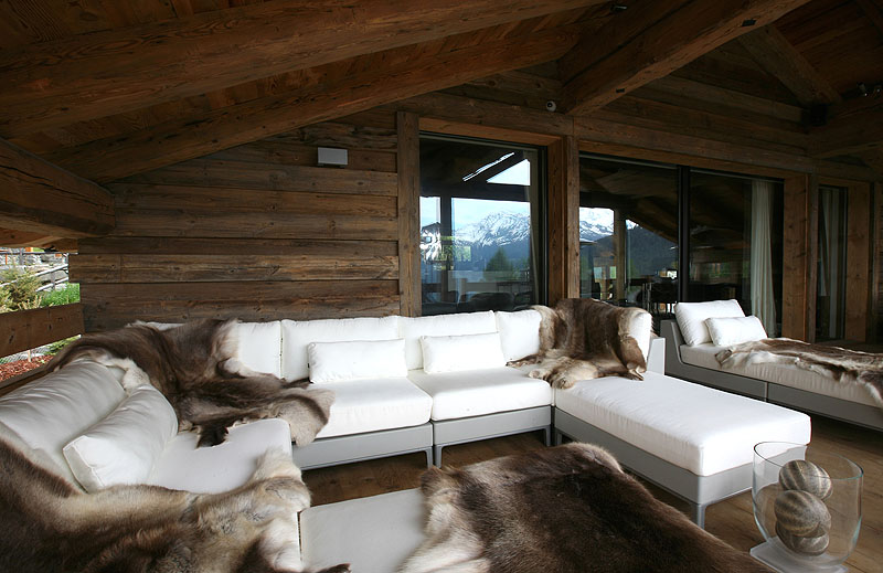 Terrasse aménagée avec sofas, épaisses peaux and espace repas design avec barbecue