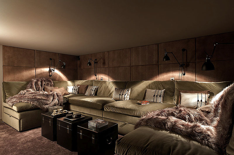 Salle de Cinéma avec canapé en U très spacieux, consoles de jeux, et jeux et jouets pour enfants.