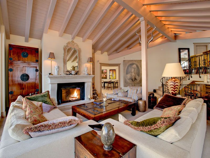 Salon avec cheminée, bar et Terrasse aménagée avec chaises longues