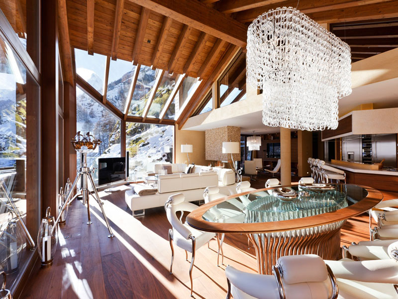 Les fenêtres panoramiques (4,5 m) dans le salon offrent le meilleur des paysages. Les intérieurs designs, propagent des couleurs chaudes; l'aménagement et les installations trouvent leur source parmi les lieux les plus luxueux de la planète et lèguent ainsi à ce chalet l'aura toute particulière d'un petit bijou, brillant sur la neige immaculée, et le panache des plus grands style.