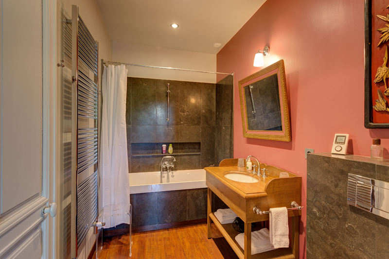 Chambre double avec lit 180 à baldaquin avec coin bureau et Salle de bain en suite avec style d’art déco avec baignoire, douche