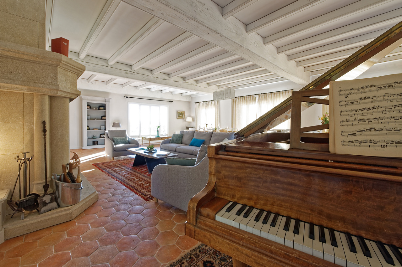 Salon - salle à manger avec accès terrasse, cheminée, piano