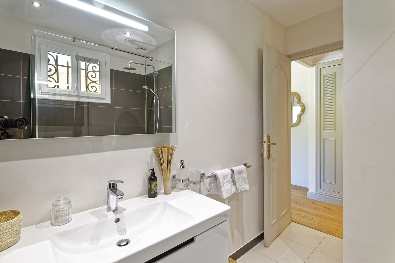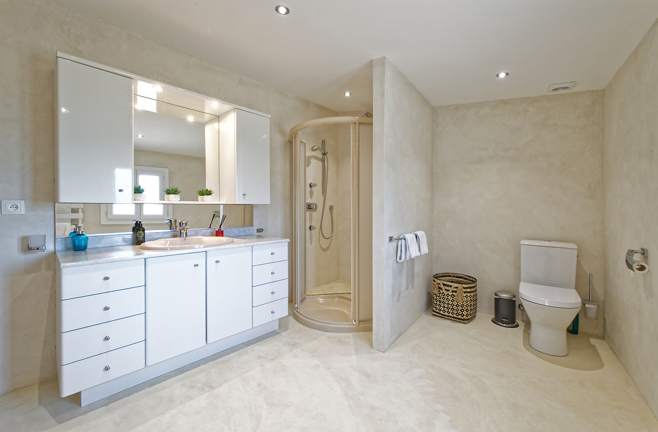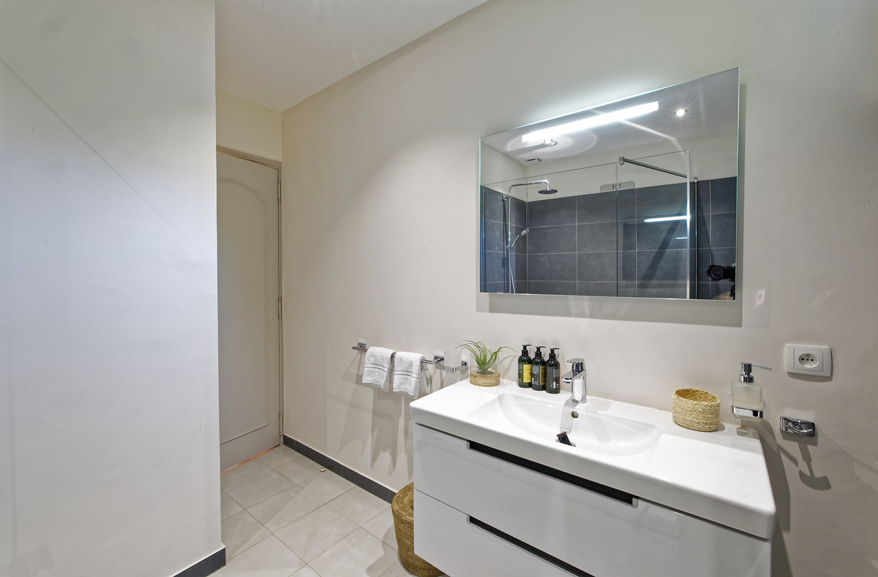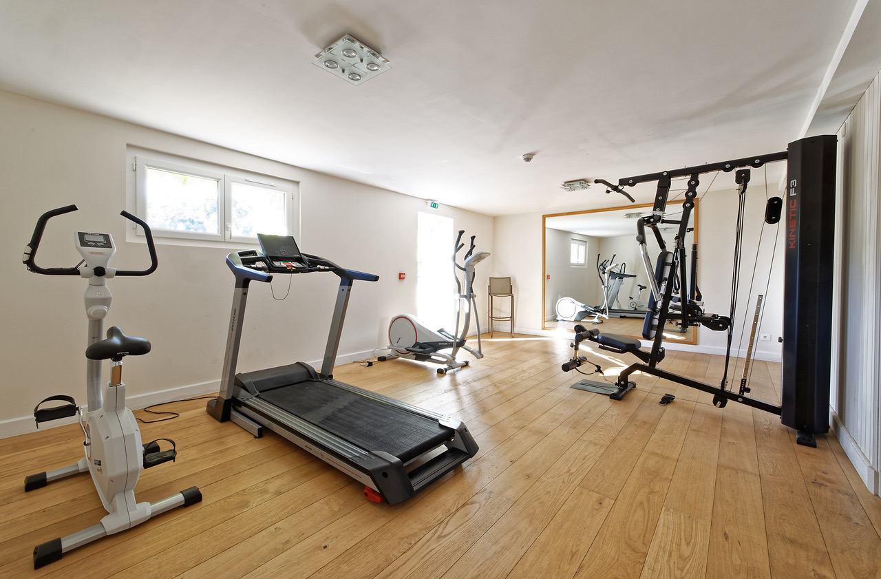 Salle de Gym avec appareils de fitness et WC d’invités et Salle de bain séparée avec douche