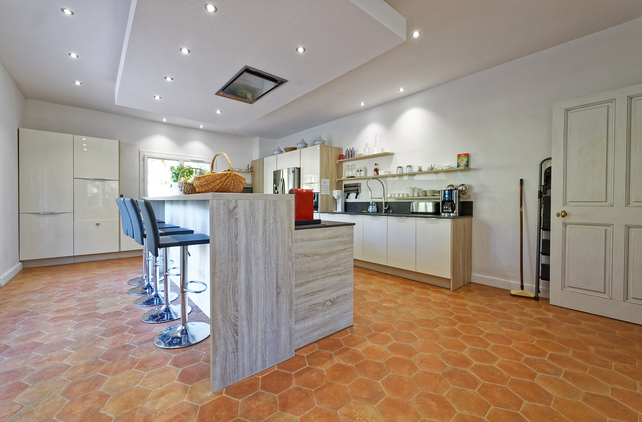 Cuisine dinatoire avec accès terrasse, four micro ondes, four électrique, plaques à induction, réfrigérateur, congélateur, lave vaisselle, cafetière nespresso, cave à vins