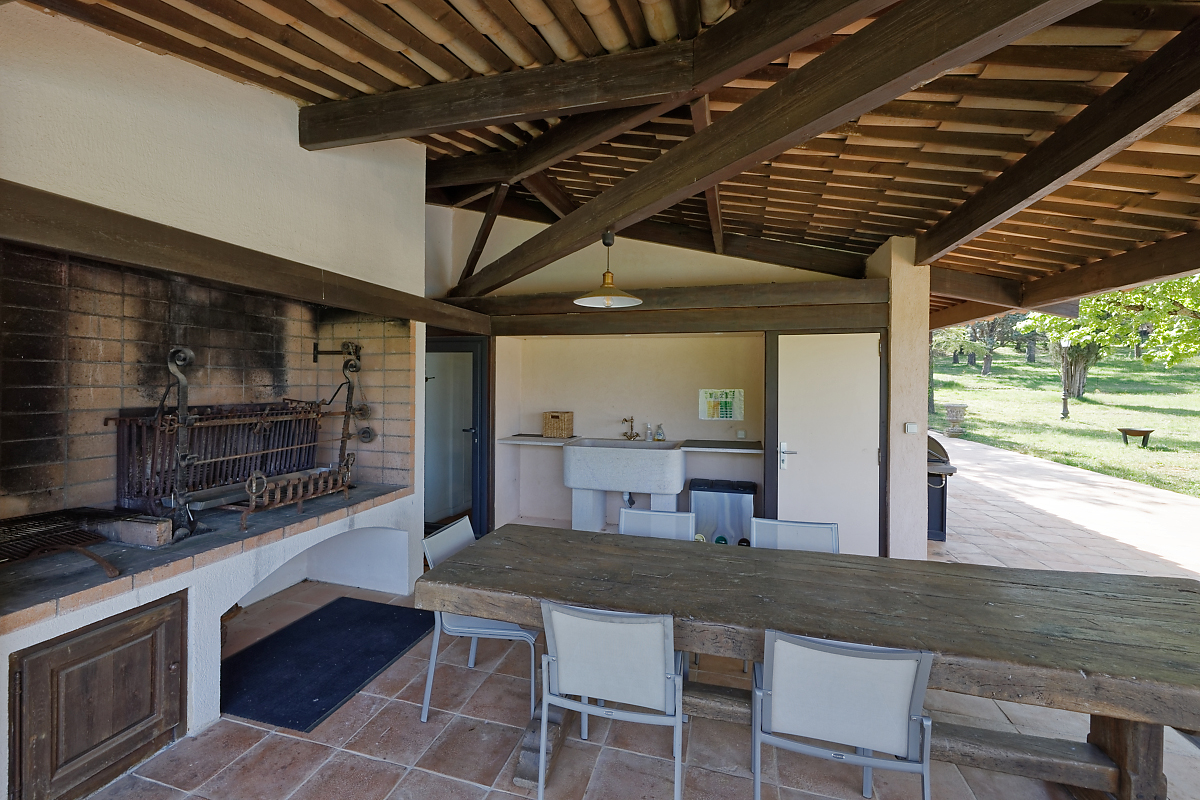 Terrasse couverte et aménagée avec barbecue, barbecue, ping pong