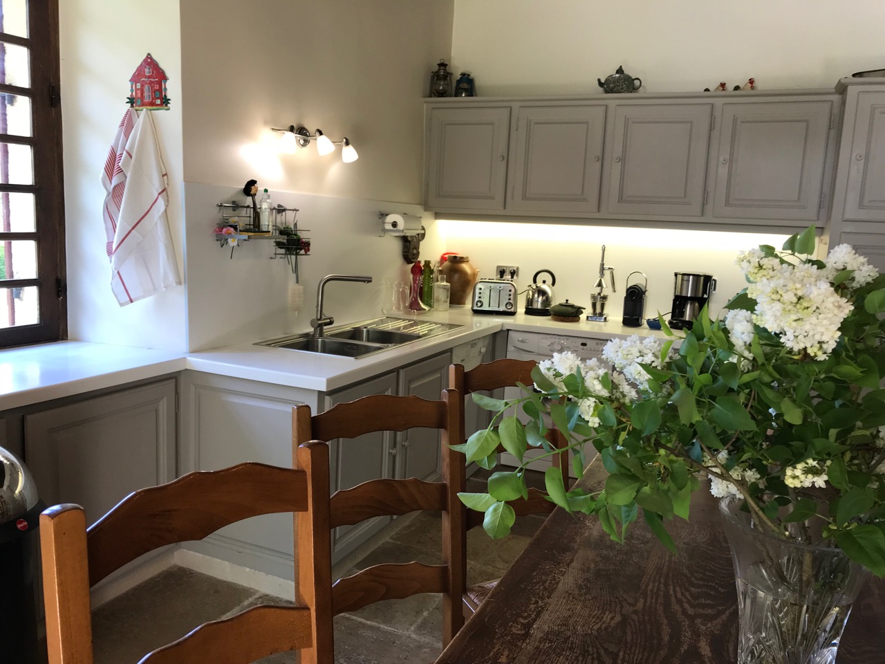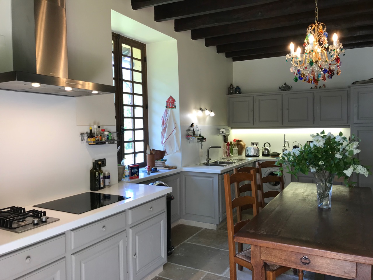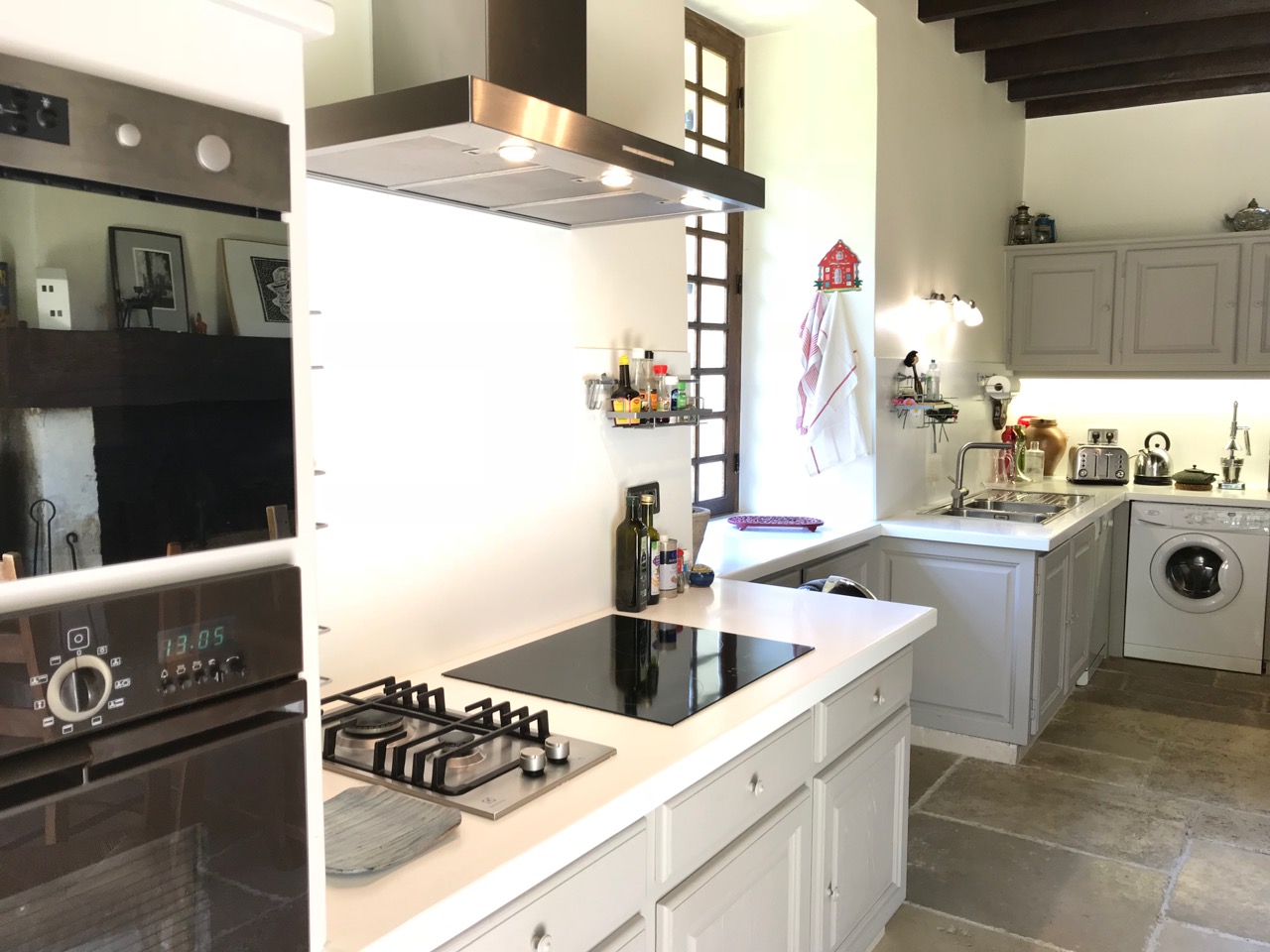 Cuisine 25 m2 avec lave linge, sèche linge, congélateur, réfrigérateur, machine à expresso, four à gaz, four micro ondes, cheminée