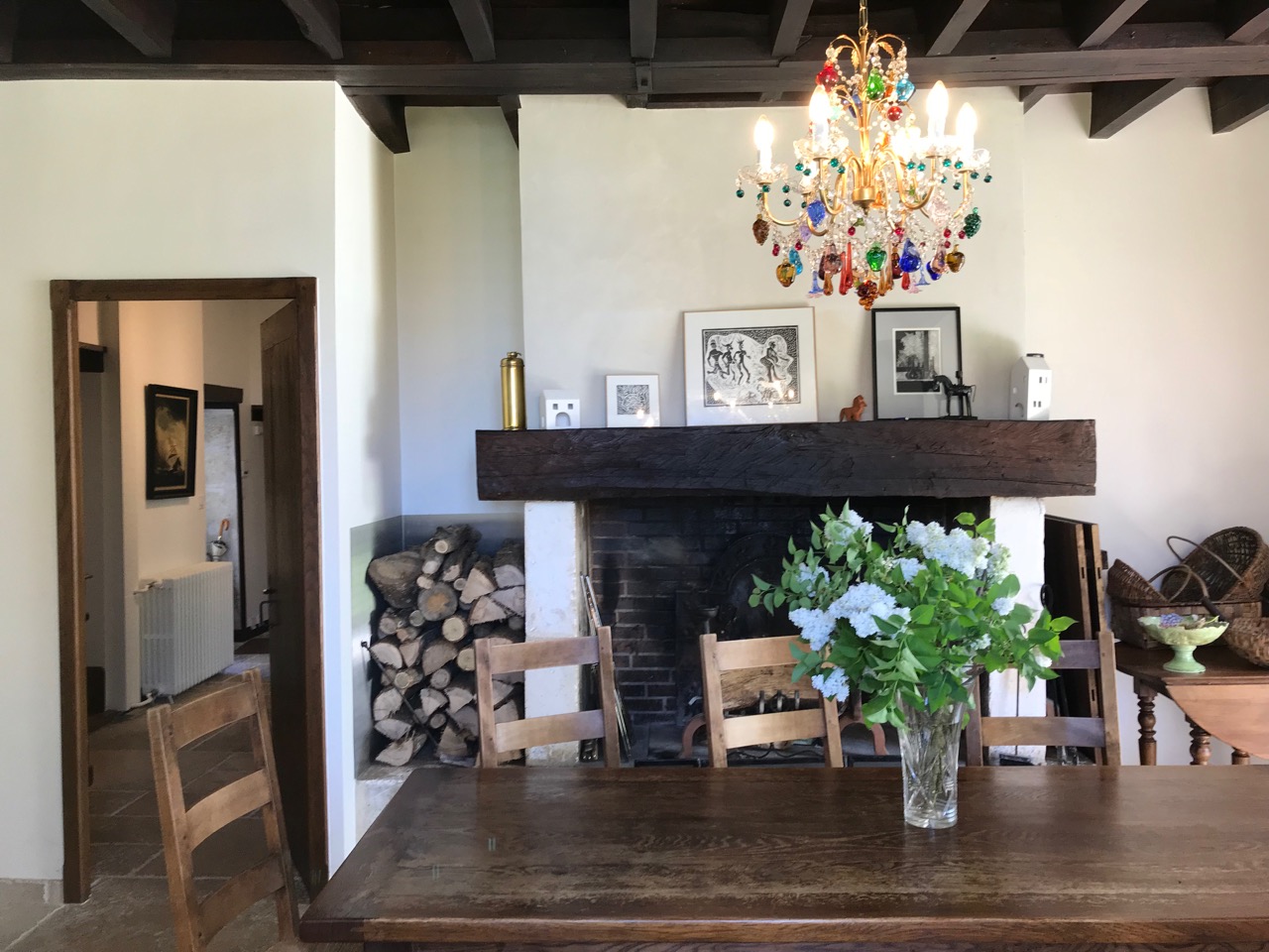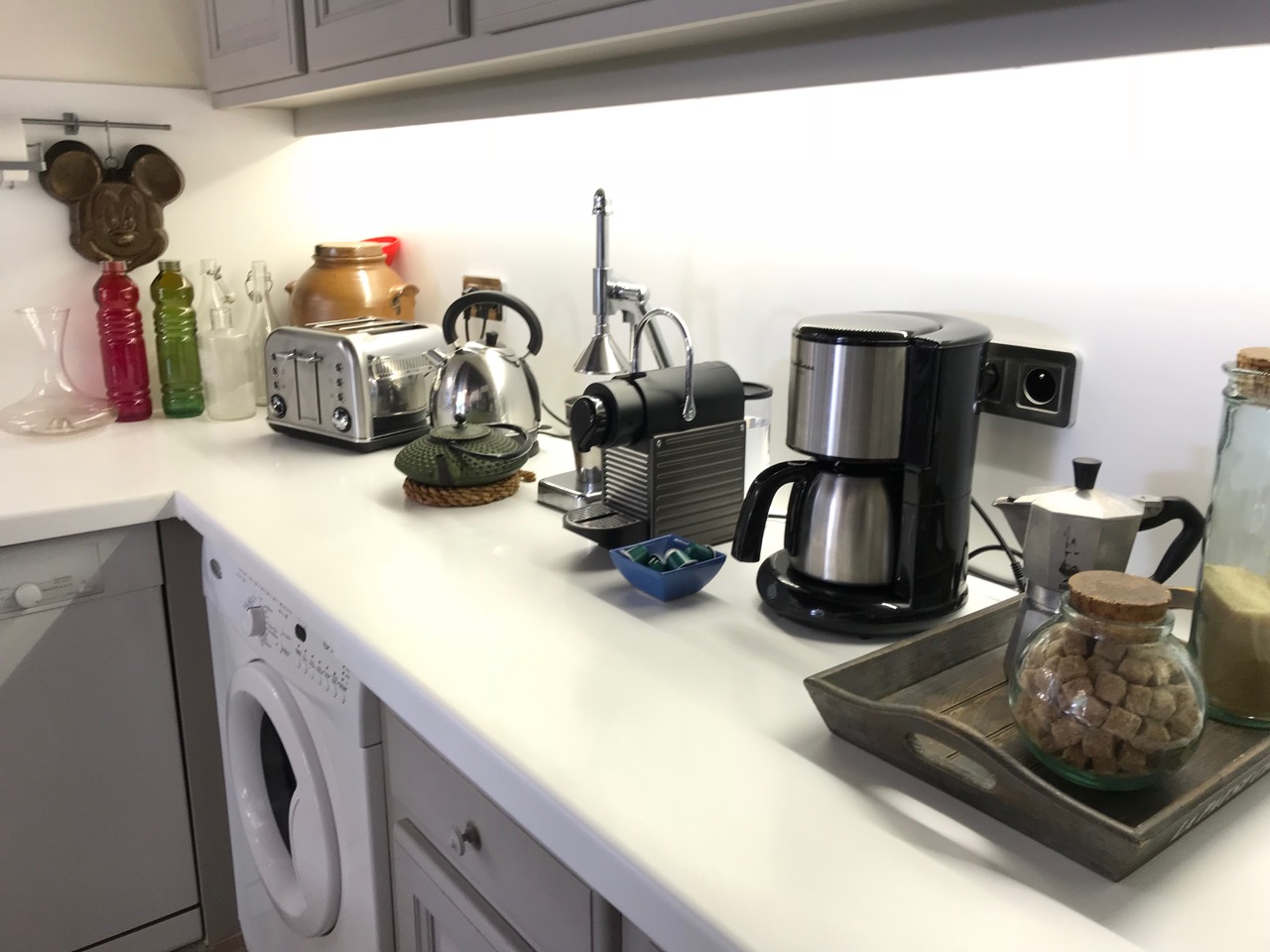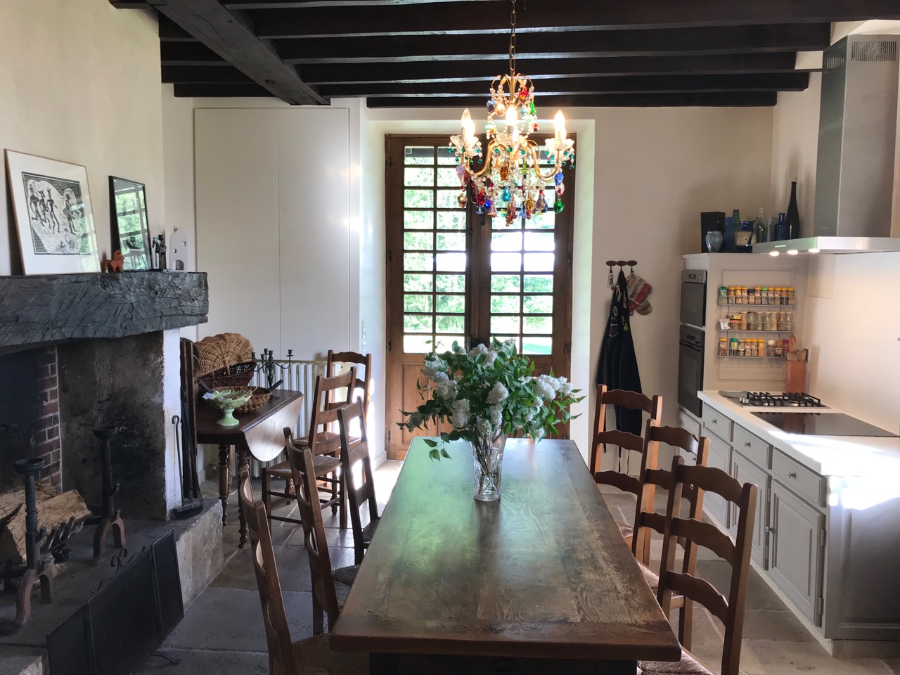 Cuisine 25 m2 avec lave linge, sèche linge, congélateur, réfrigérateur, machine à expresso, four à gaz, four micro ondes, cheminée