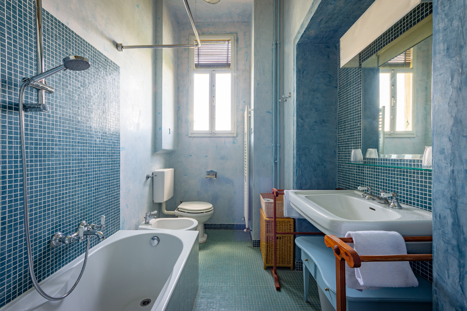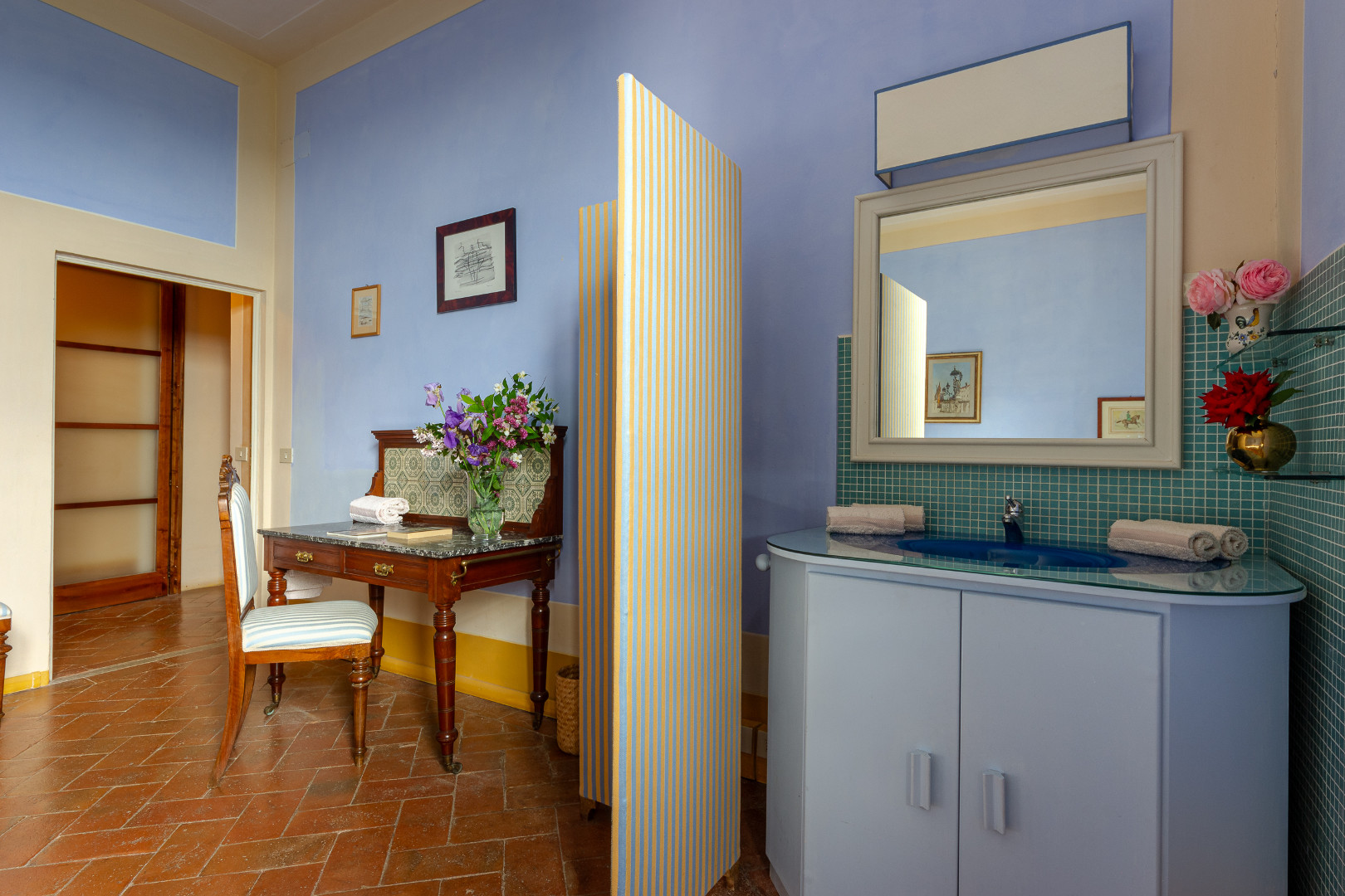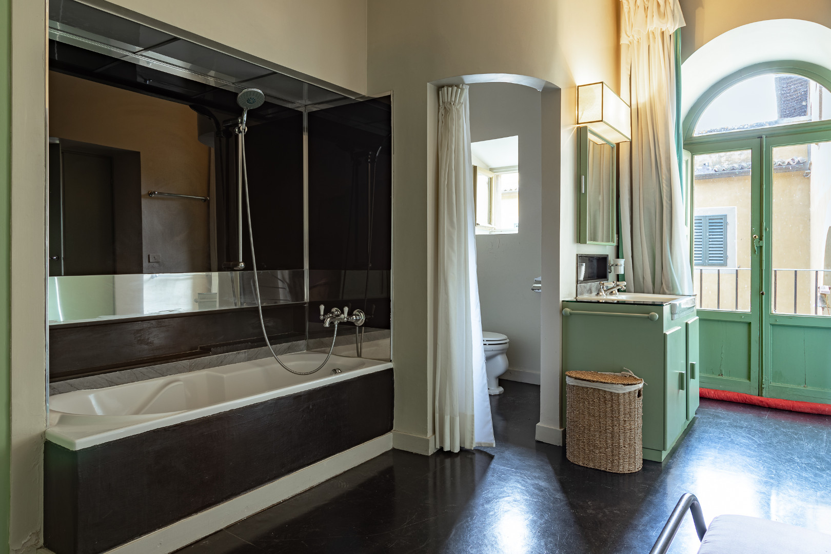 Chambre de Maître Federico avec lit à baldaquin avec climatisation, internet, couchage supplémentaire et Salle de bain en suite avec douche, baignoire