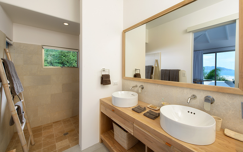 Chambre double avec lit 180, vue mer, accès terrasse, ventilateur, climatisation, coin bureau et Salle de bain en suite avec douche extérieure uniquement avec lavabo double