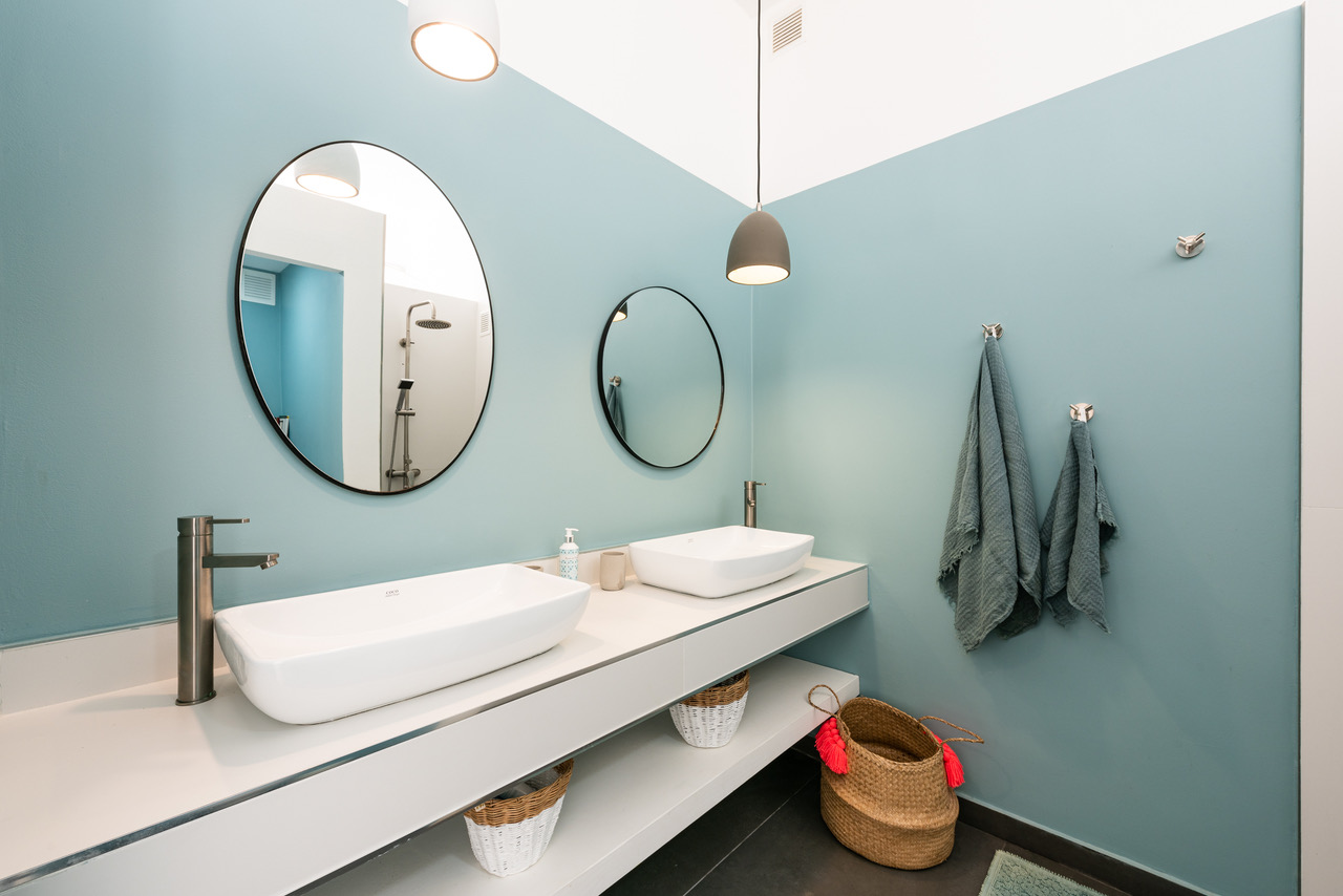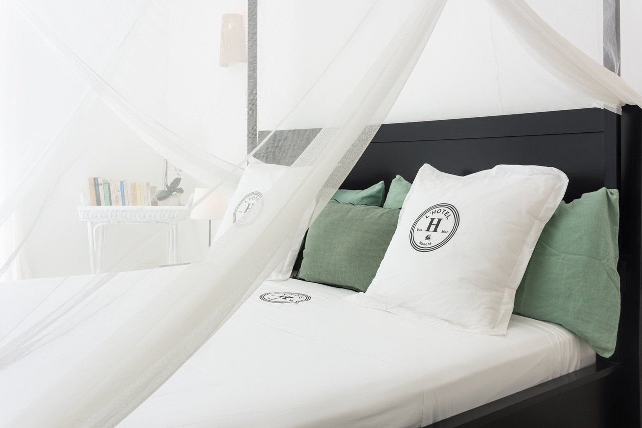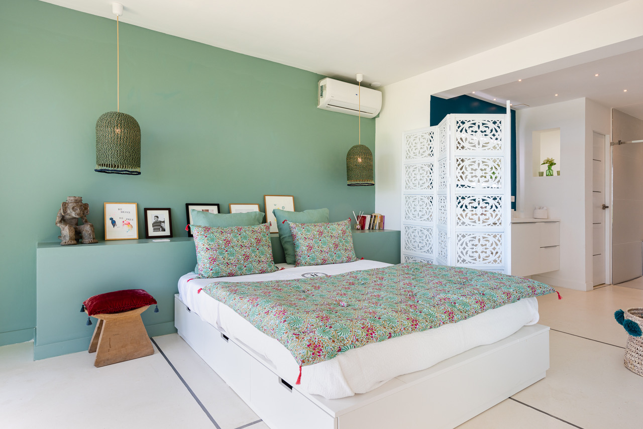 Chambre double avec un petit espace gym équipé d’un vélo éliptique et d’altères, tapis de yoga avec vue mer, accès terrasse, dressing et Salle de bain en suite