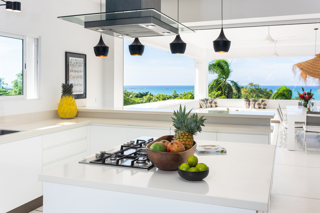 Cuisine ouverte avec four électrique, four micro ondes, cafetière, grille pain, lave vaisselle, réfrigérateur, table de cuisson à gaz, plancha électrique