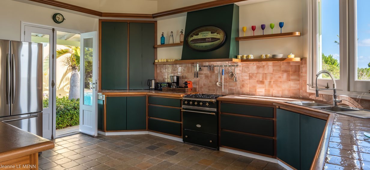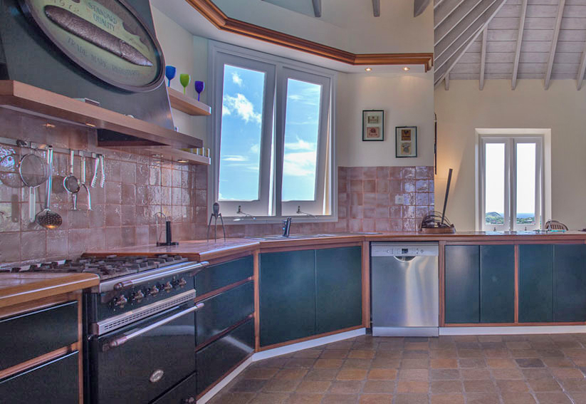 Cuisine ouverte sur la mer avec four électrique, grille pain, percolateur, four micro ondes, lave vaisselle