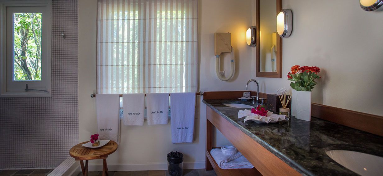 Chambre double avec climatisation, ventilateur, moustiquaire, télévision lcd, lecteur dvd, coffre fort, lit 200 et Salle de bain en suite