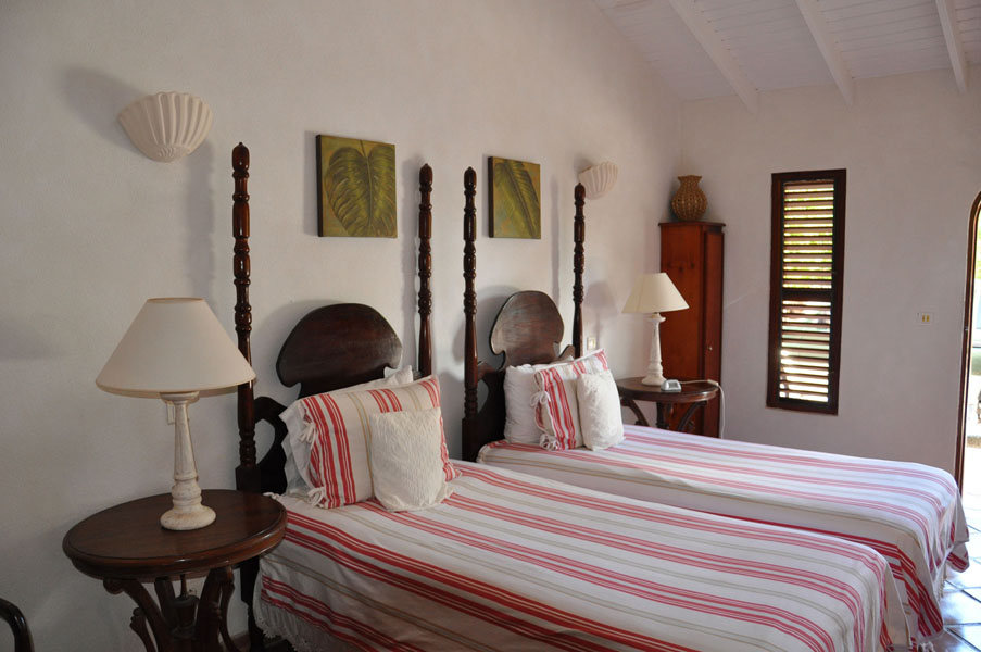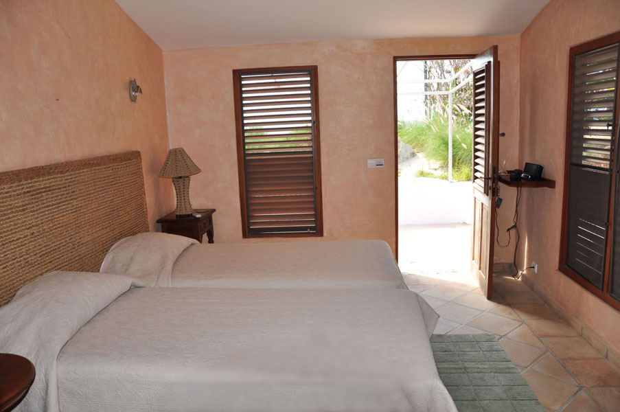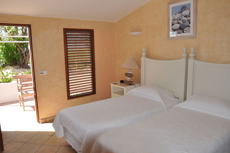 Chambre à lits jumeaux avec accès terrasse, chaine hifi, moustiquaire, climatisation, ventilateur et Salle de bain en suite avec douche, sèche cheveux