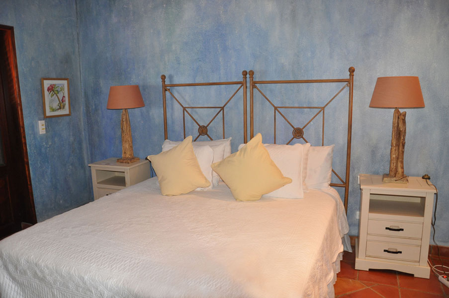 Chambre à lits jumeaux avec accès terrasse, moustiquaire, chaine hifi, climatisation, ventilateur et Salle de bain en suite avec douche, sèche cheveux