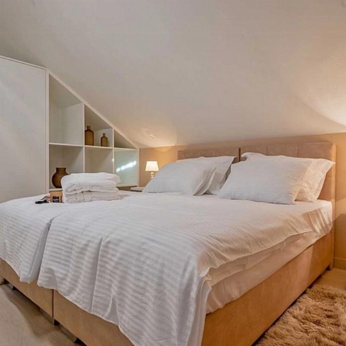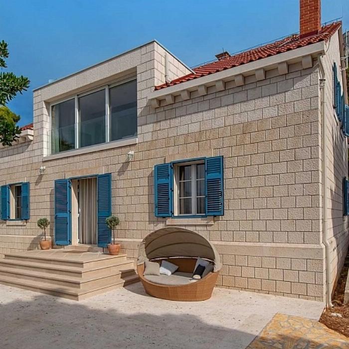 Située sur l’île de Brač, dans le village de Pučišća, cette villa en pierre dalmate associe architecture traditionnelle et aménagement contemporain. Édifiée sur deux niveaux et développant environ 320 m², elle peut accueillir jusqu’à douze personnes réparties dans cinq chambres et cinq salles de bains.