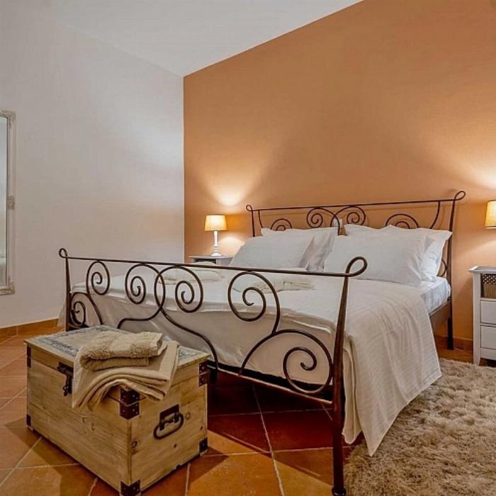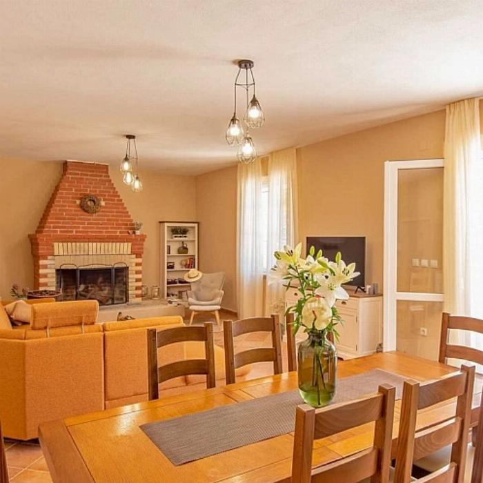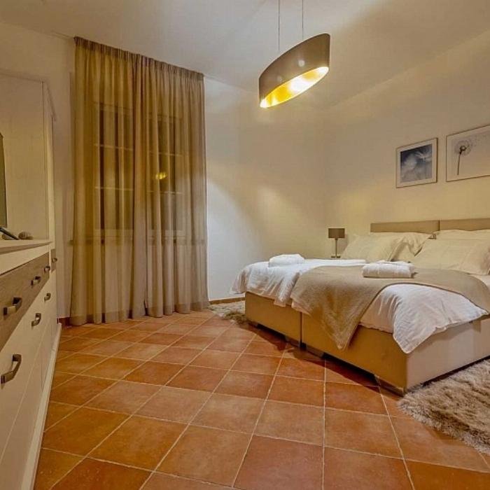 Construite en pierre locale, la maison présente une toiture en pente douce et des volets en bois caractéristiques de la région. Les intérieurs sont lumineux et organisés pour offrir confort et fonctionnalité. Le rez-de-chaussée comprend une cuisine entièrement équipée avec espace repas ouvert sur le séjour, deux chambres doubles (dont une avec salle de bains privative) ainsi qu’un espace fitness. À l’étage se trouvent trois chambres doubles (dont deux avec salle de bains privative), une salle de bains supplémentaire, ainsi qu’un second espace de vie avec cuisine et salle à manger.