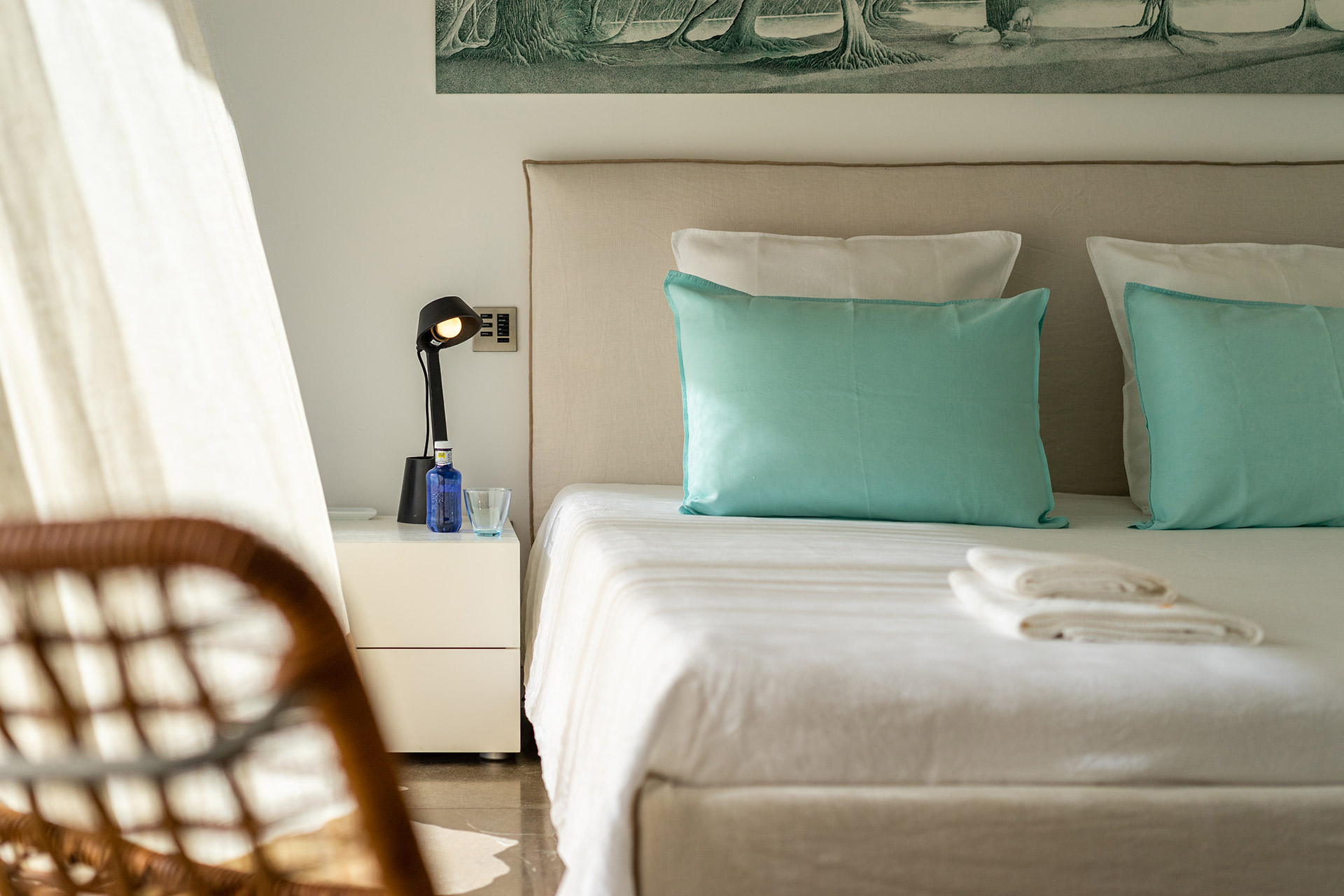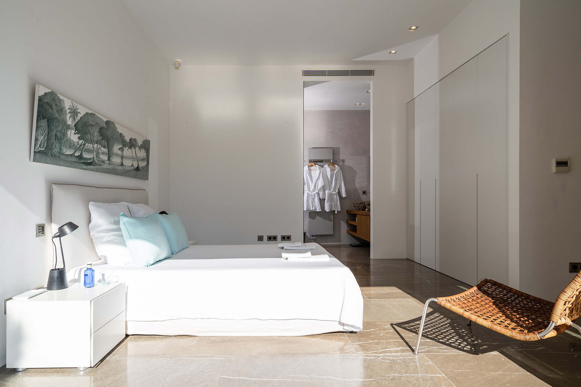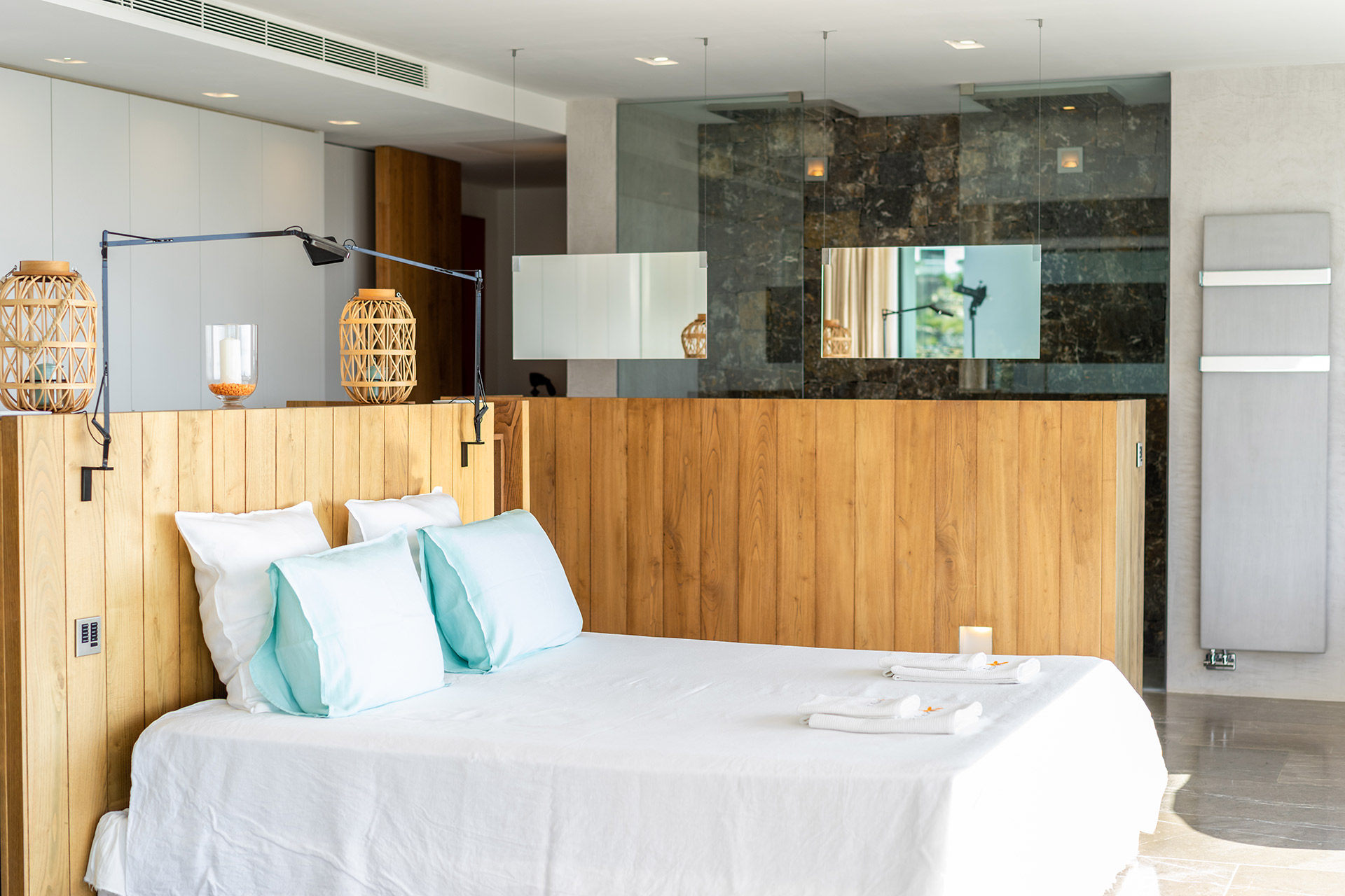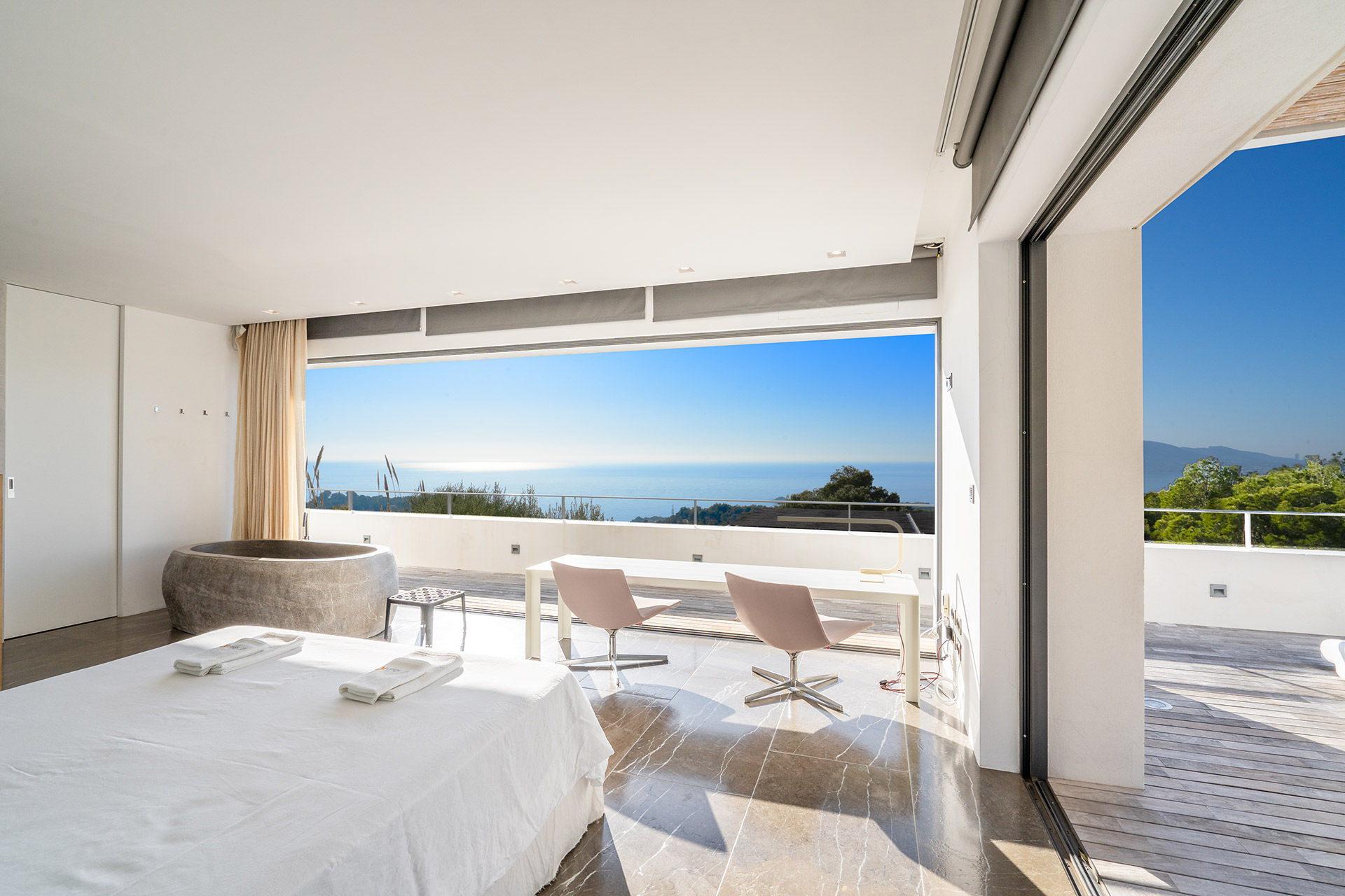 Chambre de Maître 50 m2 avec lit 180, mini bar, accès terrasse, vue mer et Salle de Bain avec baignoire, douche, douche, lavabo double, wc