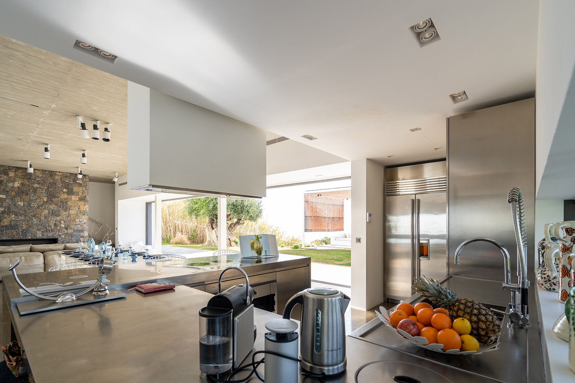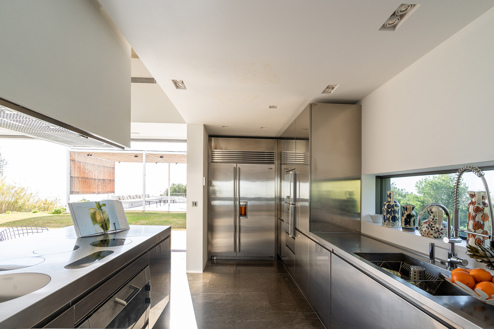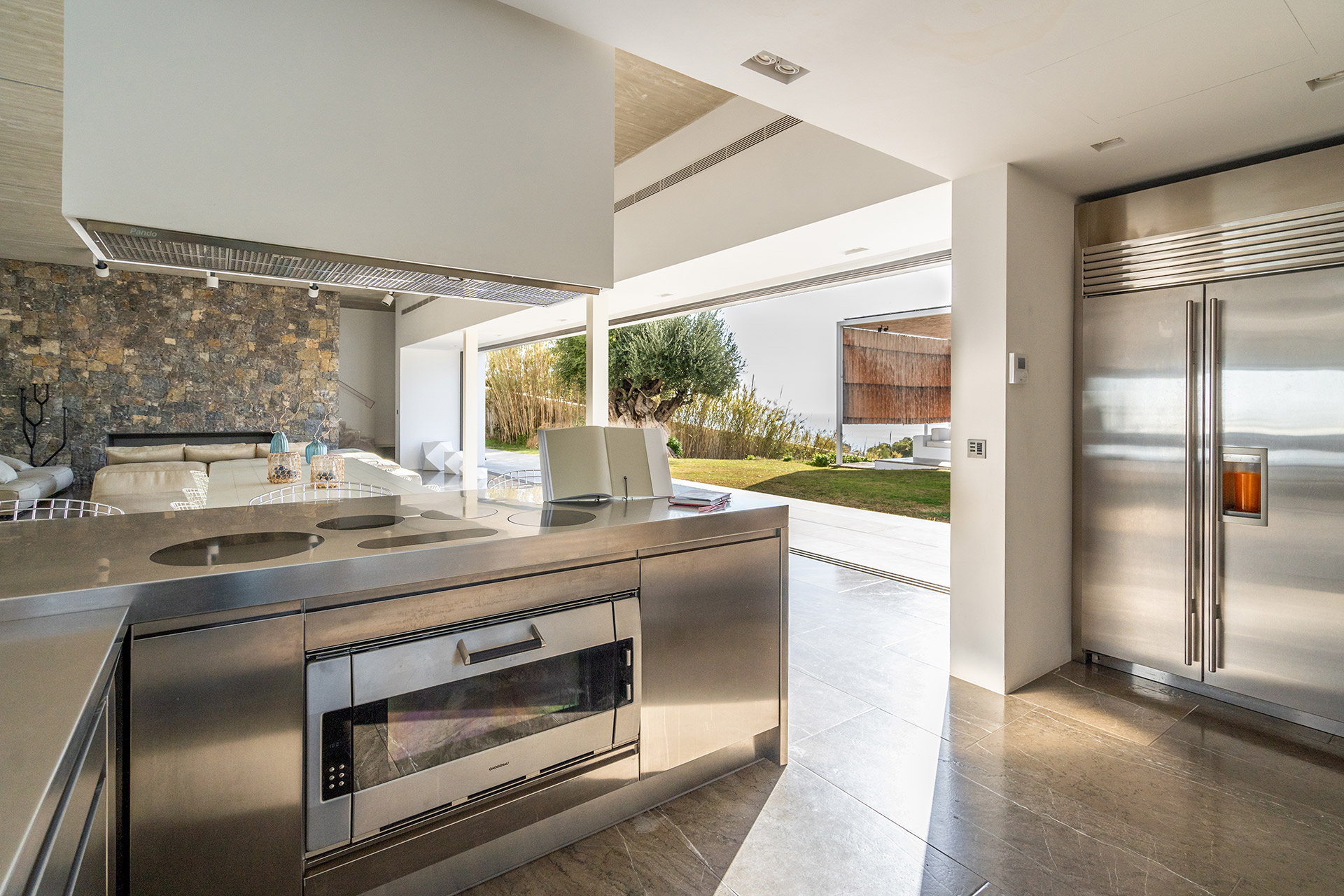 Terrasse aménagée terrasse en teck. La cuisine d’été est équipé d’un lave-vaisselle, réfrigérateur, appareil à glaçons, mini cave à vin. avec barbecue, cuisine d’été