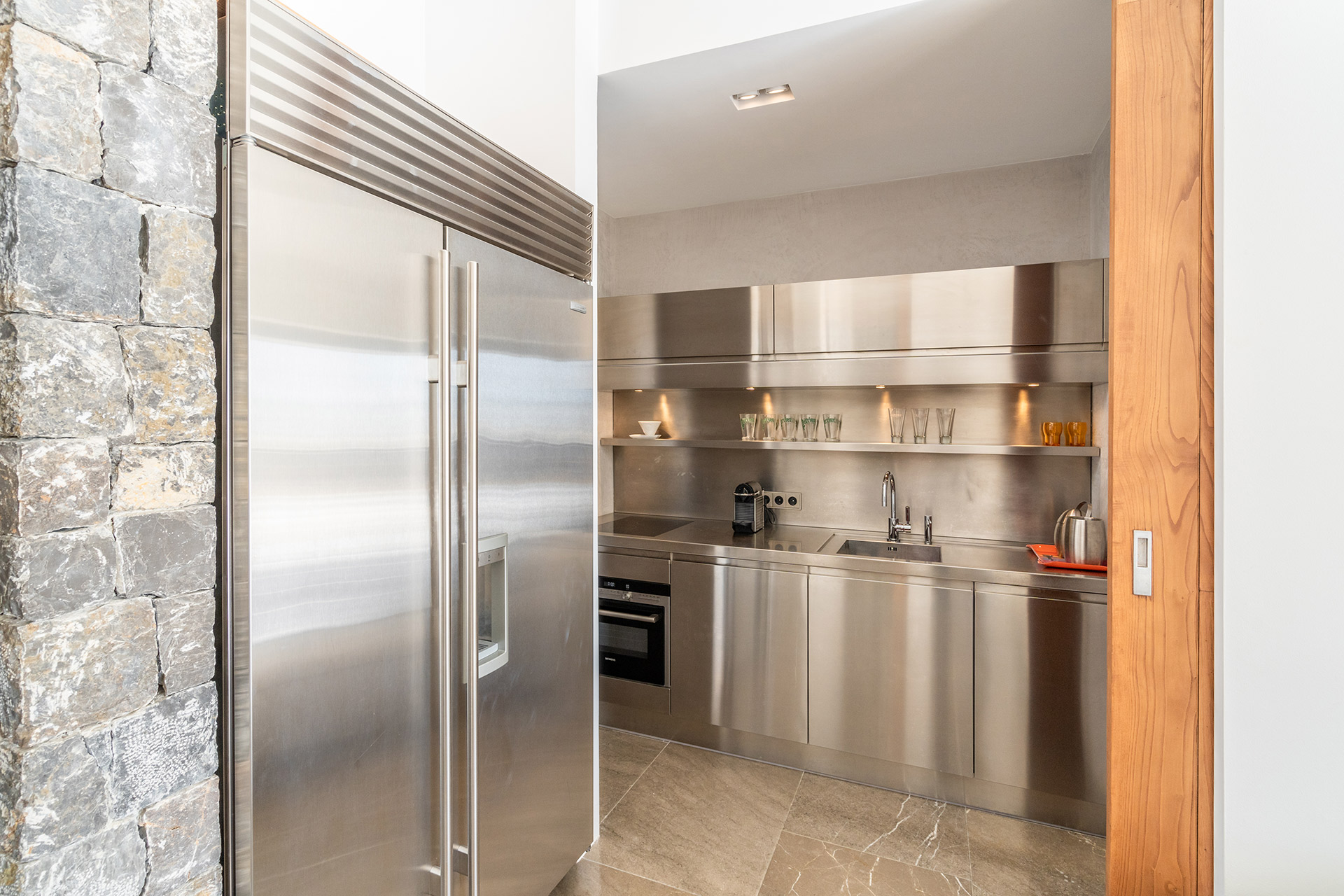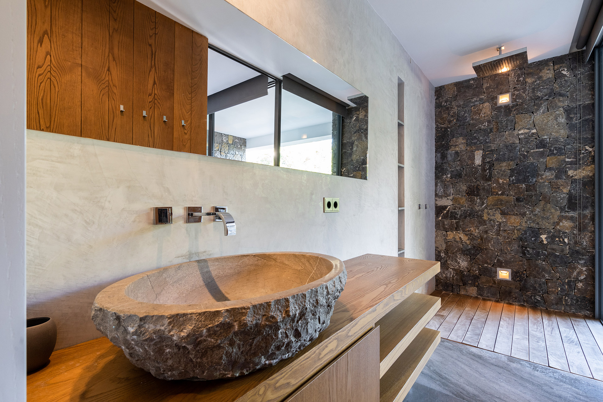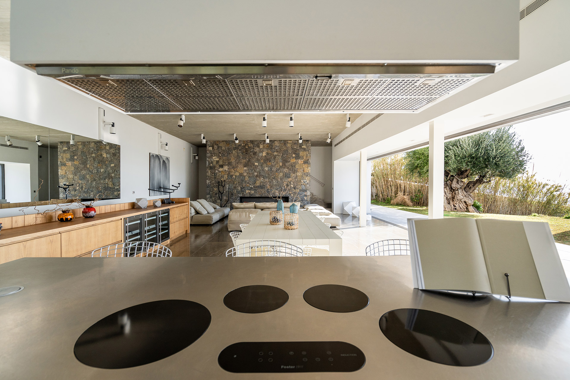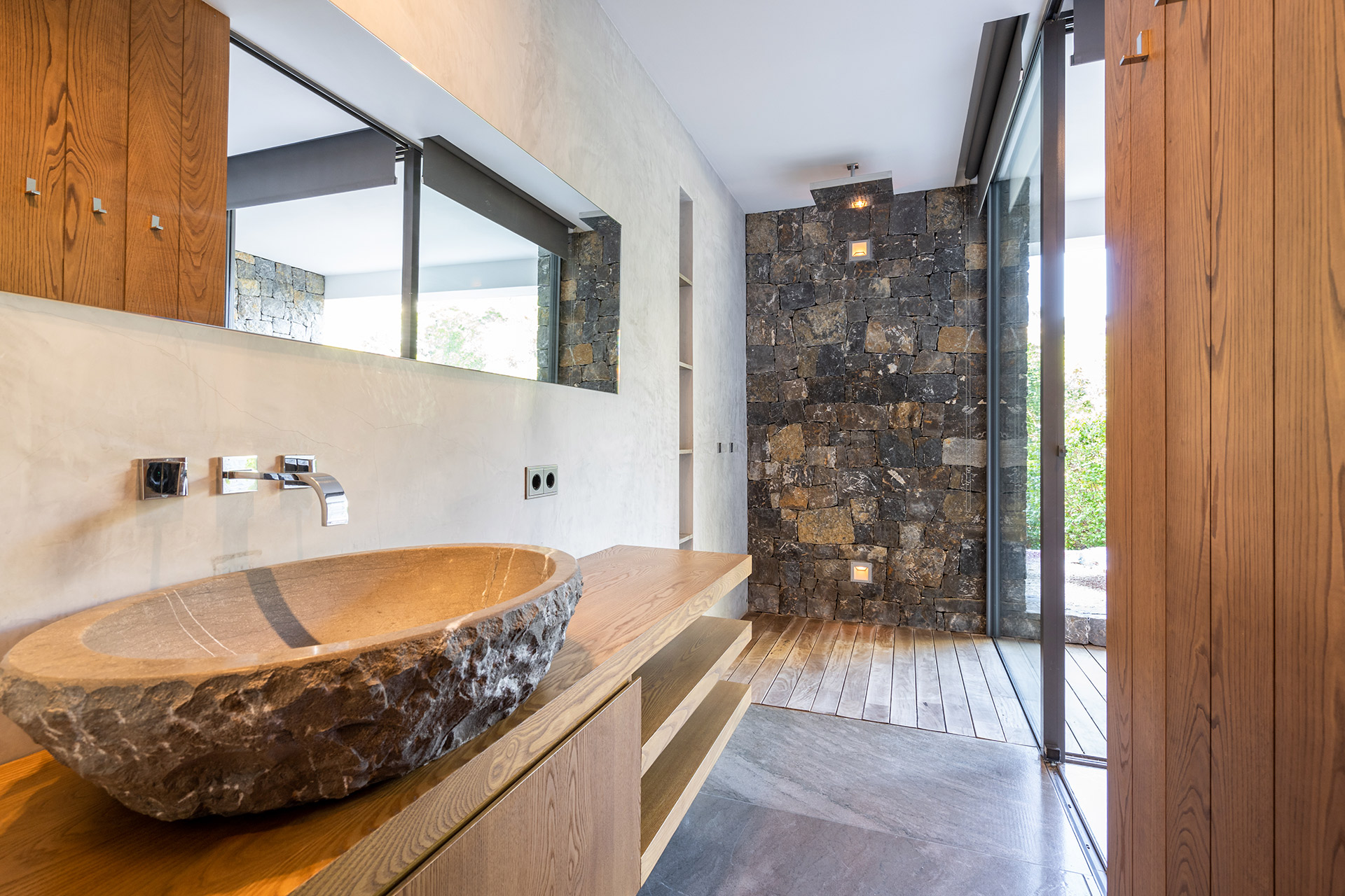 Terrasse aménagée terrasse en teck. La cuisine d’été est équipé d’un lave-vaisselle, réfrigérateur, appareil à glaçons, mini cave à vin. avec barbecue, cuisine d’été